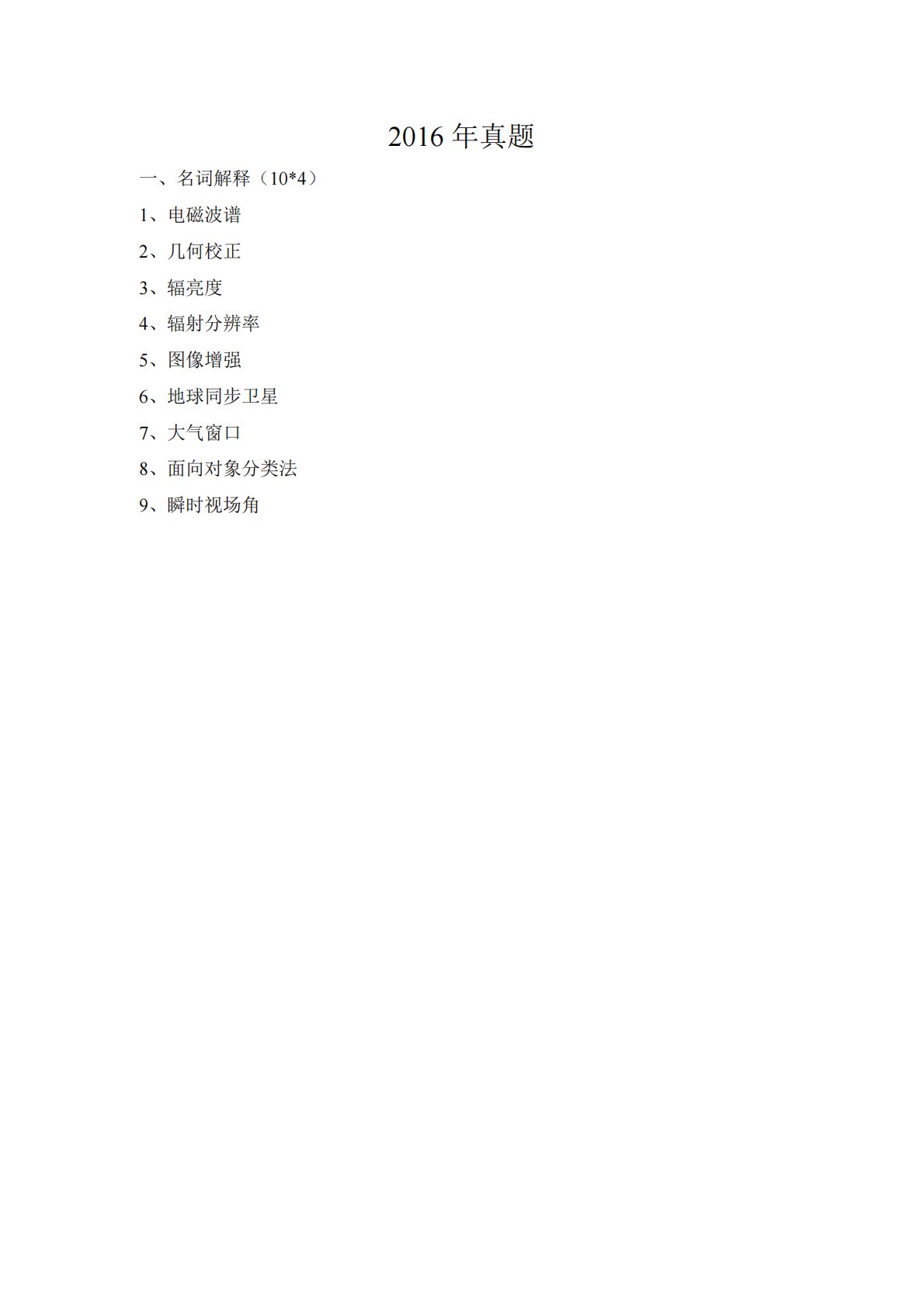2016年真题一、名词解释(10*4)1、电磁波谱2、几何校正3、辐亮度4、辐射分辨率5、图像增强6、地球同步卫星7、大气窗口8、面向对象分类法9、瞬时视场角2016年真题一、名词解释(10*4)1、电磁波谱2、几何校正3、辐亮度4、辐射分辨率5、图像增强6、地球同步卫星7、大气窗口8、面向对象分类法9、瞬时视场角10、最大似然分类法二、简答题(5*10)1、简述三种大气散射2、简述NOAA(AVHHR)和我国“风云三号”卫星图像特点3、简述微波遥感概念及特点4、目视解译的方法和基本步骤5、简述K均值算法的一般过程三、问答题(3*20)1、论述最近邻域法、双线性内插法、三次卷积内插法的优缺点2...