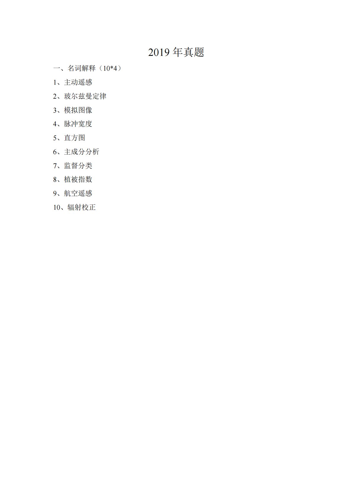 2019年真题一、名词解释(10*4)1、主动遥感2、玻尔兹曼定律3、模拟图像4、脉冲宽度5、直方图6、主成分分析7、监督分类8、植被指数9、航空遥感10、辐射校正2019年真题一、名词解释(10*4)1、主动遥感2、玻尔兹曼定律3、模拟图像4、脉冲宽度5、直方图6、主成分分析7、监督分类8、植被指数9、航空遥感10、辐射校正二、简答题(5*10)1、波段数越多,传感器获取的光谱信号越多,但是也不是波段数越多,对遥感观测就越好,怎么理解这句话2、大气窗口有哪几个波段3、几何精校正的原理和具体步骤是什么4、水体的光谱特征,水体提取的方法是什么5、简述遥感图像分类的步骤三、问答题(3*20)1、简...