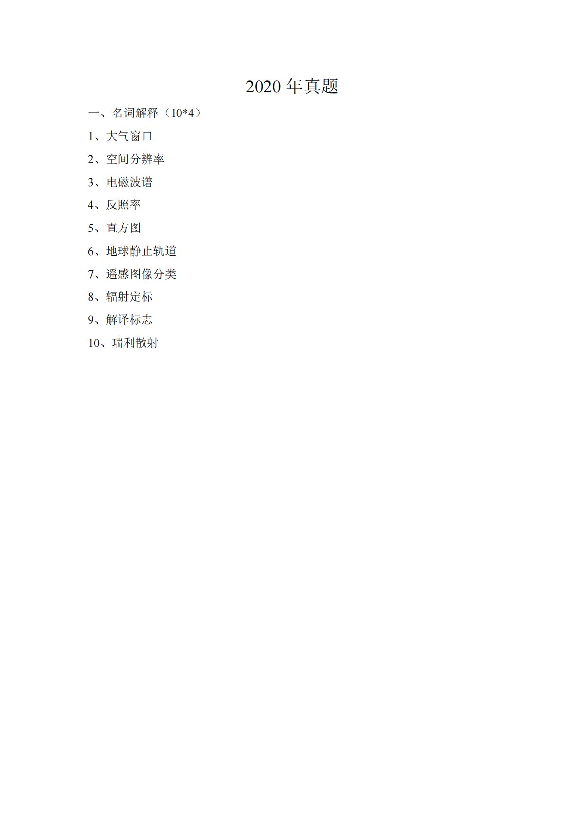 2020年真题一、名词解释(10*4)1、大气窗口2、空间分辨率3、电磁波谱4、反照率5、直方图6、地球静止轨道7、遥感图像分类8、辐射定标9、解译标志10、瑞利散射2020年真题一、名词解释(10*4)1、大气窗口2、空间分辨率3、电磁波谱4、反照率5、直方图6、地球静止轨道7、遥感图像分类8、辐射定标9、解译标志10、瑞利散射二、简答题(5*10)1、为什么光谱图像要同时设置全色波段和多光谱波段2、为什么基于高空间分辨率的图像分类常用面向对象的分类法,有什么优点3、简答为什么海水是蓝色的4、简述森林火灾常用哪个波段监测,为什么用这个波段5、简述主成分分析的典型用途三、问答题(3*20)1、...
