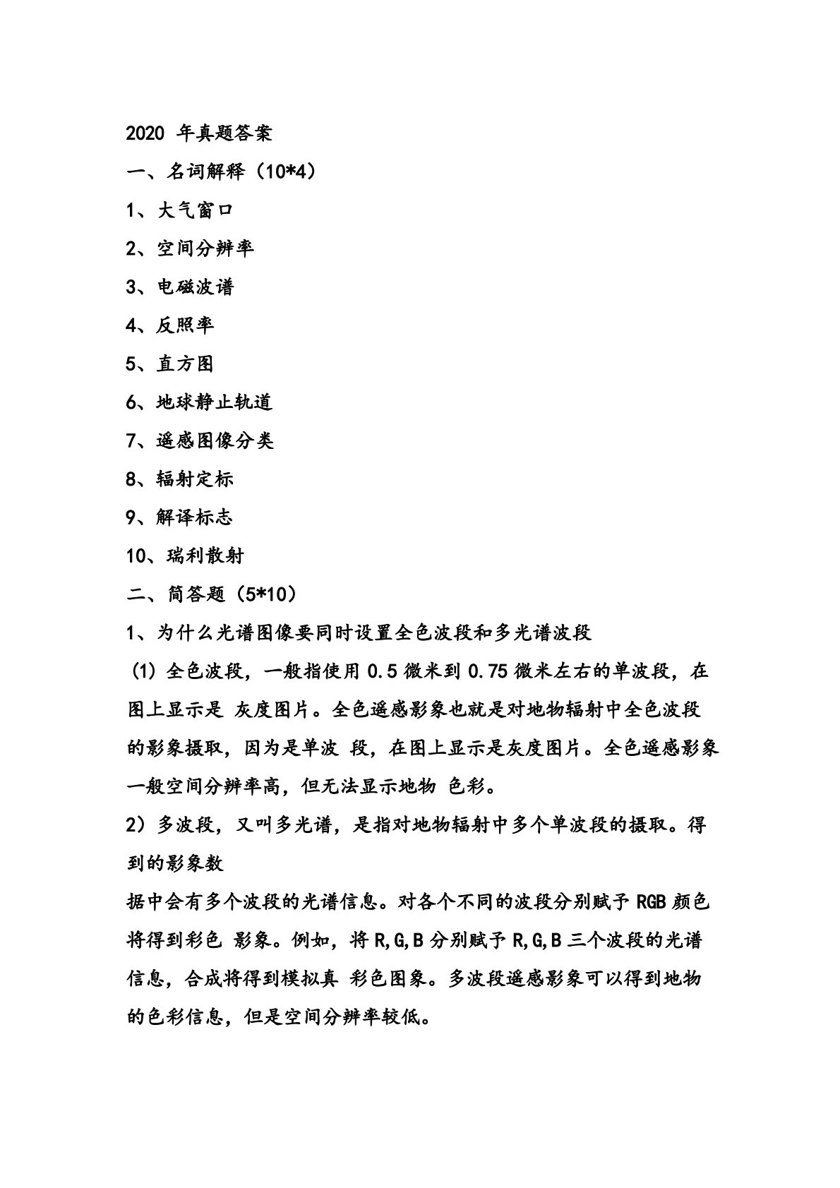 2020年真题答案一、名词解释(10*4)1、大气窗口2、空间分辨率3、电磁波谱4、反照率5、直方图6、地球静止轨道7、遥感图像分类8、辐射定标9、解译标志10、瑞利散射二、简答题(5*10)1、为什么光谱图像要同时设置全色波段和多光谱波段(1)全色波段,一般指使用0.5微米到0.75微米左右的单波段,在图上显示是灰度图片。全色遥感影象也就是对地物辐射中全色波段的影象摄取,因为是单波段,在图上显示是灰度图片。全色遥感影象一般空间分辨率高,但无法显示地物色彩。2)多波段,又叫多光谱,是指对地物辐射中多个单波段的摄取。得到的影象数据中会有多个波段的光谱信息。对各个不同的波段分别赋予RGB颜色将得到...