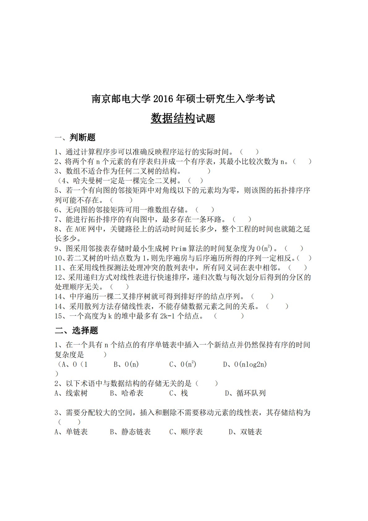 南京邮电大学811数据结构2016年真题