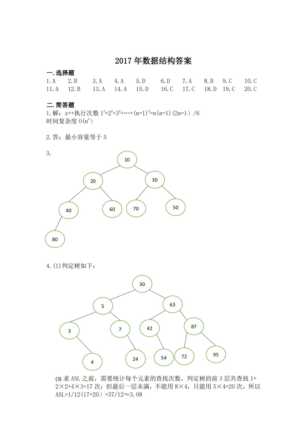 2017年数据结构答案一.选择题1.A2.B3.A4.A5.D6.D7.A8.B9.C10.C11.A12.B13.A14.A15.D16.C17.C18.D19.C20.C二.简答题1.解:x++执行次数12+22+32+…+(n-1)2=n(n-1)(2n-1)/6时间复杂度O(n3)2.答:最小容量等于53.4.(1)判定树如下:(3)求ASL之前,需要统计每个元素的查找次数。判定树的前3层共查找1+2×2+4×3=17次;但最后一层未满,不能用8×4,只能用5×4=20次,所以ASL=1/12(17+20)=37/12≈3.0830302050706040801063587427395...