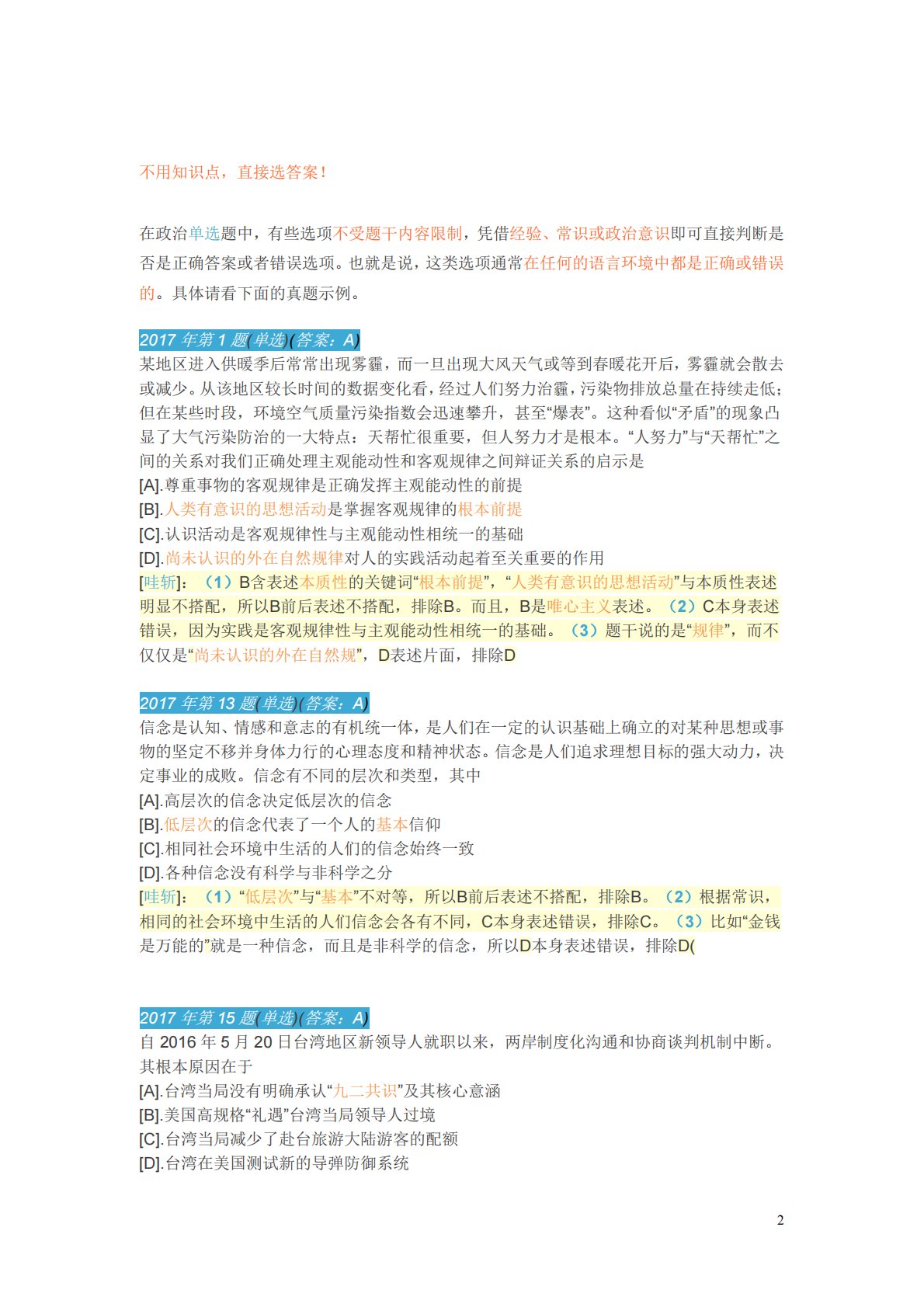 不用知识点,直接选答案!在政治单选题中,有些选项不受题干内容限制,凭借经验、常识或政治意识即可直接判断是否是正确答案或者错误选项。也就是说,这类选项通常在任何的语言环境中都是正确或错误的。具体请看下面的真题示例。2017年第1题(单选)(答案:A)某地区进入供暖季后常常出现雾霾,而一旦出现大风天气或等到春暖花开后,雾霾就会散去或减少。从该地区较长时间的数据变化看,经过人们努力治霾,污染物排放总量在持续走低;但在某些时段,环境空气质量污染指数会迅速攀升,甚至“爆表”。这种看似“矛盾”的现象凸显了大气污染防治的一大特点:天帮忙很重要,但人努力才是根本。“人努力”与“天帮忙”之间的关系对我们正确处理...