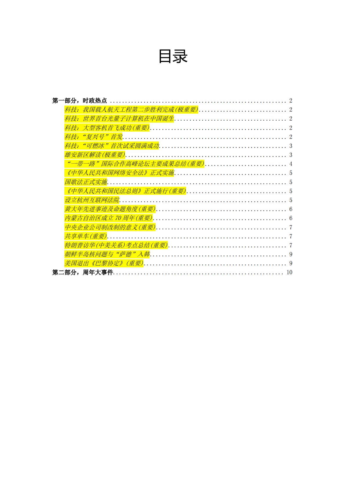 目录第一部分,时政热点..........................................................2科技:我国载人航天工程第二步胜利完成(极重要).............................2科技:世界首台光量子计算机在中国诞生.....................................2科技:大型客机首飞成功(重要).............................................2科技:“复兴号”首发....................................................