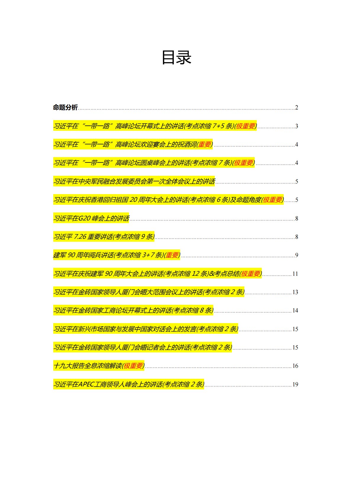目录命题分析........................................................................\...................................................................2习近平在“一带一路”高峰论坛开幕式上的讲话(考点浓缩7+5条)(极重要)........................3习近平在“一带一路”高峰论坛欢迎宴会上的祝酒词(重要)....................................................4习近平在“一带一路”高...