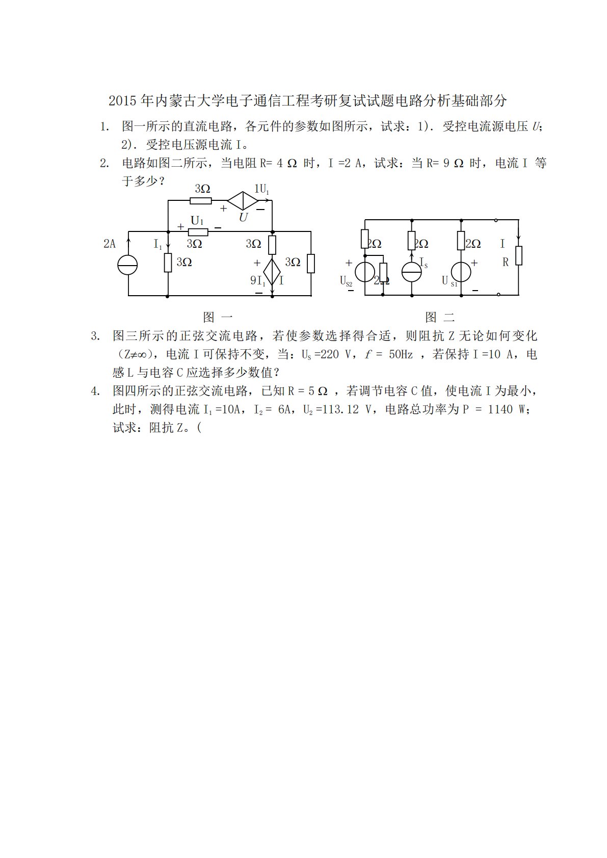 U1U32015年内蒙古大学电子通信工程考研复试试题电路分析基础部分1.图一所示的直流电路,各元件的参数如图所示,试求:1).受控电流源电压U;2).受控电压源电流I。2.电路如图二所示,当电阻R=4时,I=2A,试求:当R=9时,电流I等于多少?1U12AI133222I33ISR9I1IUS22US1图一图二3.图三所示的正弦交流电路,若使参数选择得合适,则阻抗Z无论如何变化(Z),电流I可保持不变,当:US=220V,f=50Hz,若保持I=10A,电感L与电容C应选择多少数值?4.图四所示的正弦交流电路,已知R=5,若调节电容C值,使电流I为最小,...