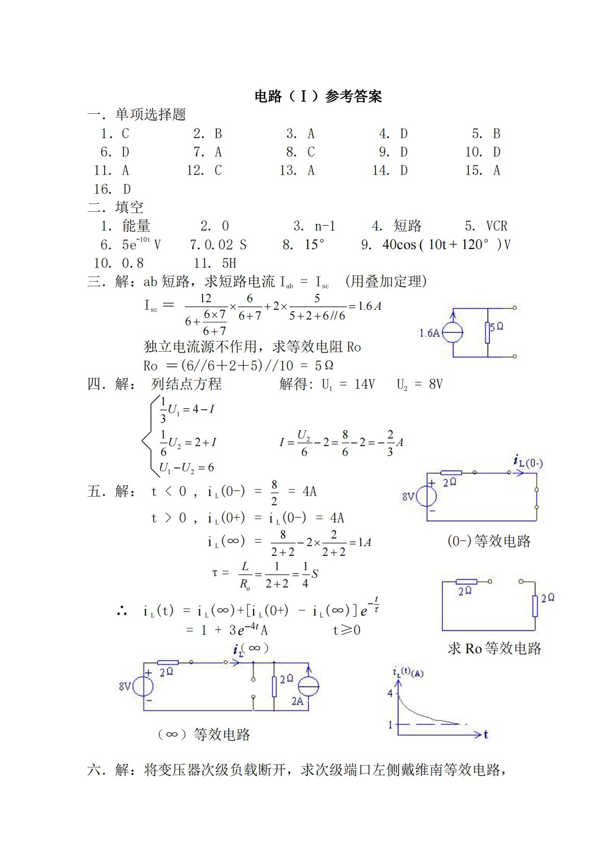 电路(Ⅰ)参考答案一.单项选择题1.C2.B3.A4.D5.B6.D7.A8.C9.D10.D11.A12.C13.A14.D15.A16.D二.填空1.能量2.03.n-14.短路5.VCR6.5e-10tV7.0.02S8.15°9.40cos(10t+120°)V10.0.811.5H三.解:ab短路,求短路电流Iab=Isc(用叠加定理)Isc=126521.66767526//6667A独立电流源不作用,求等效电阻RoRo=(6//6+2+5)//10=5Ω四.解:列结点方程解得:U1=14VU2=8V12121431266UIUIUU28222663...
