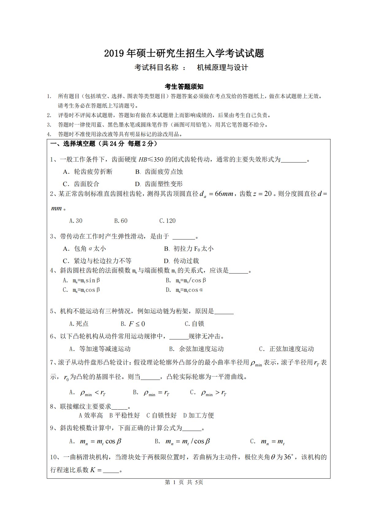 第1页共5页2019年硕士研究生招生入学考试试题考试科目名称:机械原理与设计考生答题须知1.所有题目(包括填空、选择、图表等类型题目)答题答案必须做在考点发给的答题纸上,做在本试题册上无效。请考生务必在答题纸上写清题号。2.评卷时不评阅本试题册,答题如有做在本试题册上而影响成绩的,后果由考生自己负责。3.答题时一律使用蓝、黑色墨水笔或圆珠笔作答(画图可用铅笔),用其它笔答题不给分。4.答题时不准使用涂改液等具有明显标记的涂改用品。一、选择填空题(共24分每题2分)1、一般工作条件下,齿面硬度HB≤350的闭式齿轮传动,通常的主要失效形式为。A.轮齿疲劳折断B.齿面疲劳点蚀C.齿面胶合D.齿面塑...