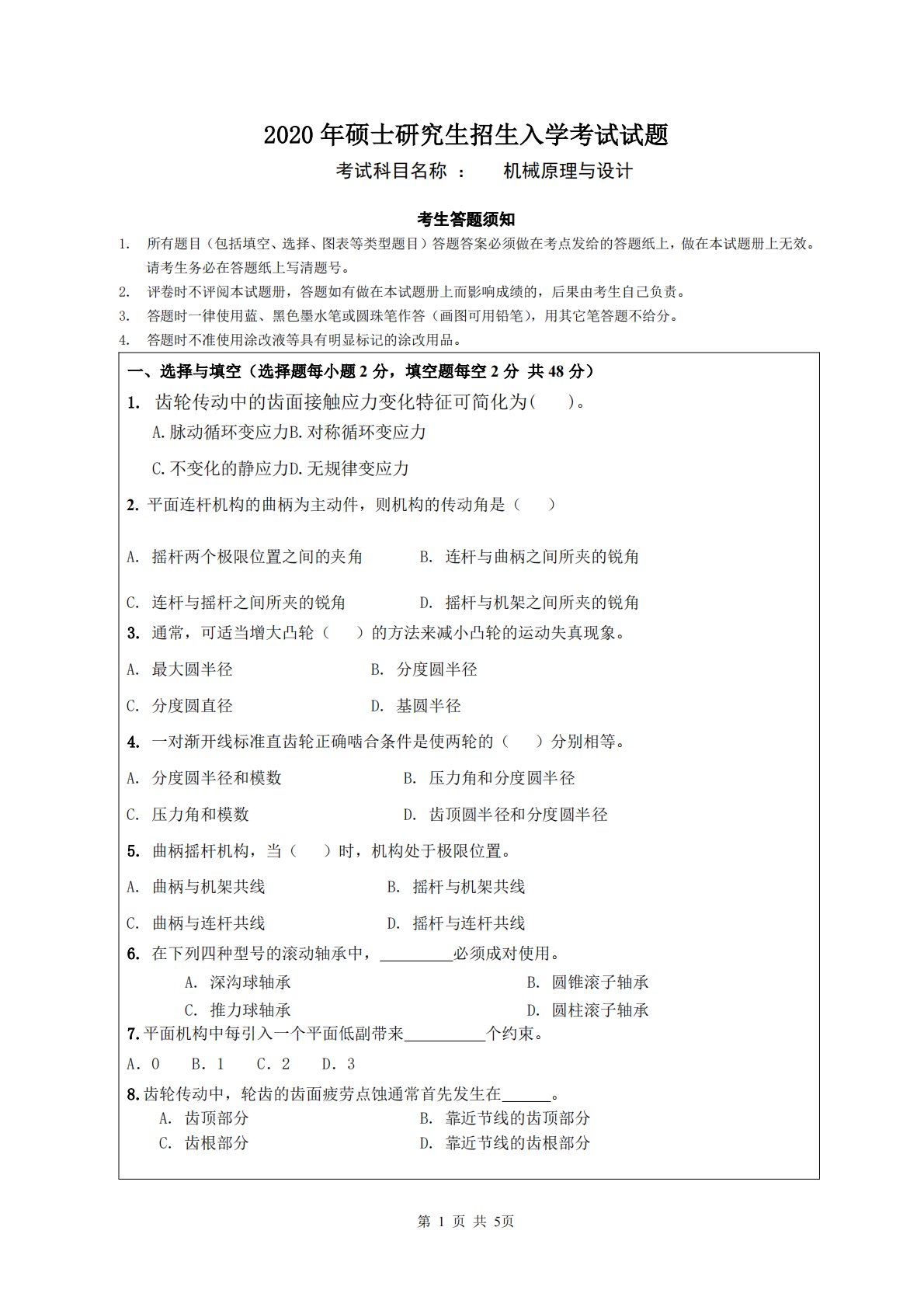 第1页共5页2020年硕士研究生招生入学考试试题考试科目名称:机械原理与设计考生答题须知1.所有题目(包括填空、选择、图表等类型题目)答题答案必须做在考点发给的答题纸上,做在本试题册上无效。请考生务必在答题纸上写清题号。2.评卷时不评阅本试题册,答题如有做在本试题册上而影响成绩的,后果由考生自己负责。3.答题时一律使用蓝、黑色墨水笔或圆珠笔作答(画图可用铅笔),用其它笔答题不给分。4.答题时不准使用涂改液等具有明显标记的涂改用品。一、选择与填空(选择题每小题2分,填空题每空2分共48分)1.齿轮传动中的齿面接触应力变化特征可简化为()。A.脉动循环变应力B.对称循环变应力C.不变化的静应力D....