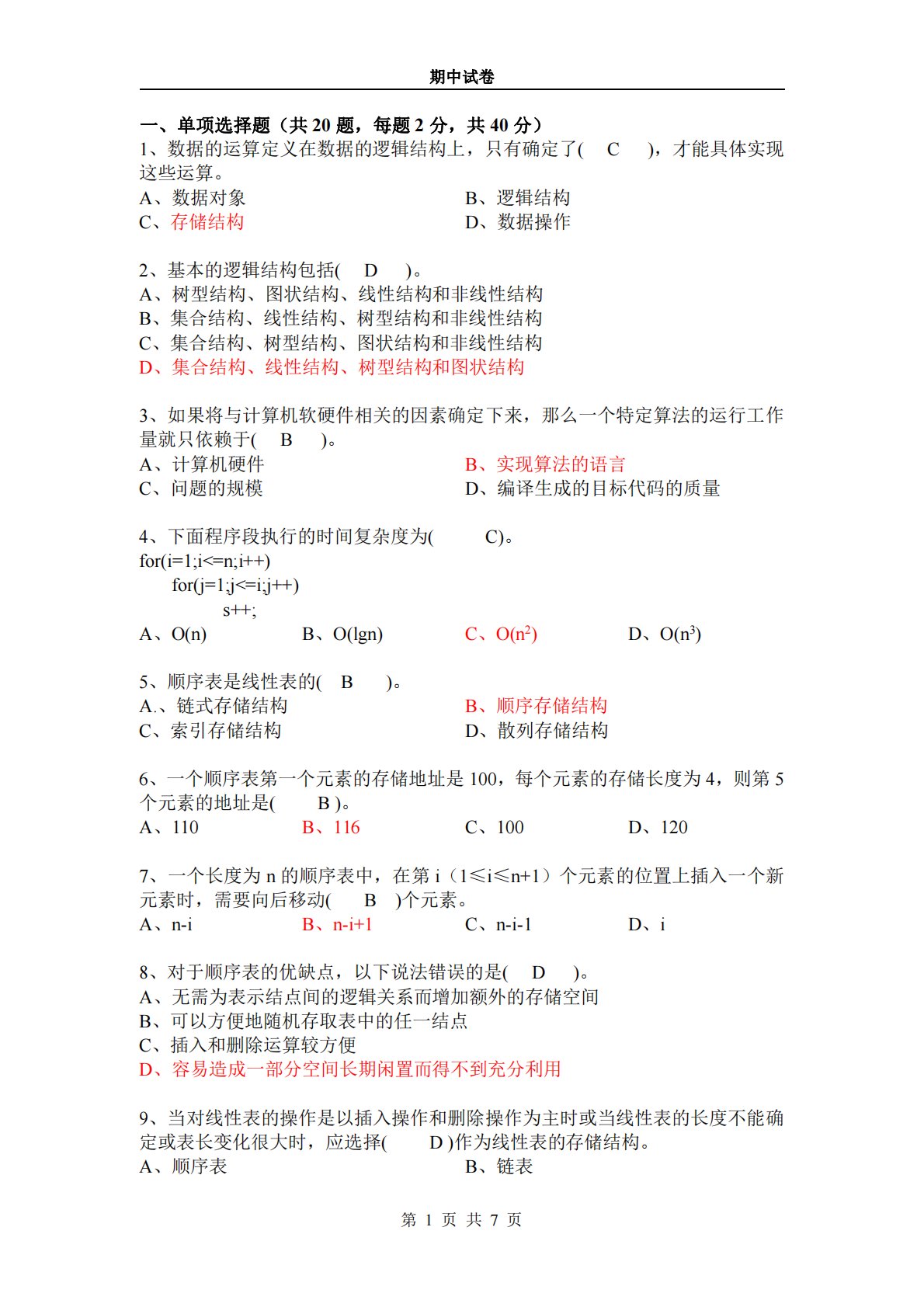 期中试卷第1页共7页一、单项选择题(共20题,每题2分,共40分)1、数据的运算定义在数据的逻辑结构上,只有确定了(C),才能具体实现这些运算。A、数据对象B、逻辑结构C、存储结构D、数据操作2、基本的逻辑结构包括(D)。A、树型结构、图状结构、线性结构和非线性结构B、集合结构、线性结构、树型结构和非线性结构C、集合结构、树型结构、图状结构和非线性结构D、集合结构、线性结构、树型结构和图状结构3、如果将与计算机软硬件相关的因素确定下来,那么一个特定算法的运行工作量就只依赖于(B)。A、计算机硬件B、实现算法的语言C、问题的规模D、编译生成的目标代码的质量4、下面程序段执行的时间复杂度为(C)。...