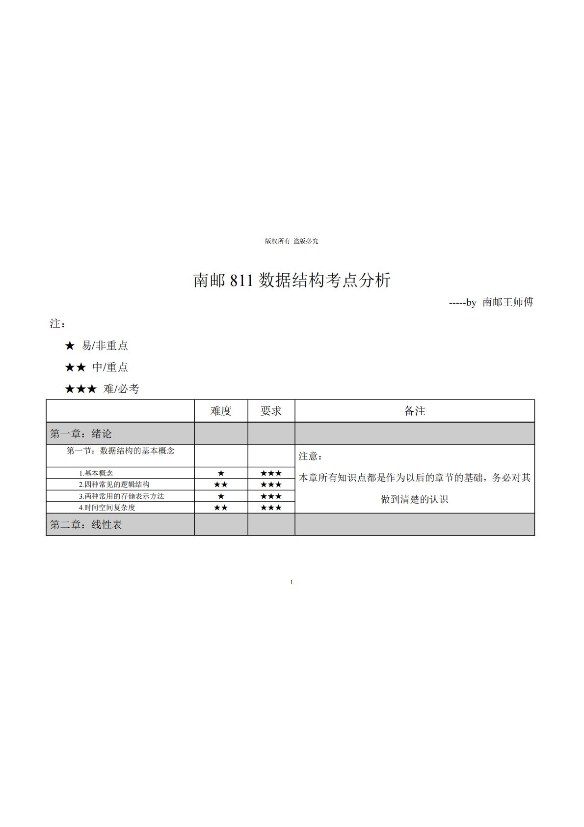 版权所有盗版必究1南邮811数据结构考点分析-----by南邮王师傅注:★易/非重点★★中/重点★★★难/必考难度要求备注第一章:绪论第一节:数据结构的基本概念注意:本章所有知识点都是作为以后的章节的基础,务必对其做到清楚的认识1.基本概念★★★★2.四种常见的逻辑结构★★★★★3.两种常用的存储表示方法★★★★4.时间空间复杂度★★★★★第二章:线性表版权所有盗版必究2第一节:线性表的顺序表示1.ADT描述★★★注意:本节对于线性表的要求是最基本的要求,务必深入理解。2.查找,插入,删除操作★★★★3.顺序表的应用★★★★第二节:线性表的链表表示1.单(双)链表,单(双)循环链表的ADT描述...