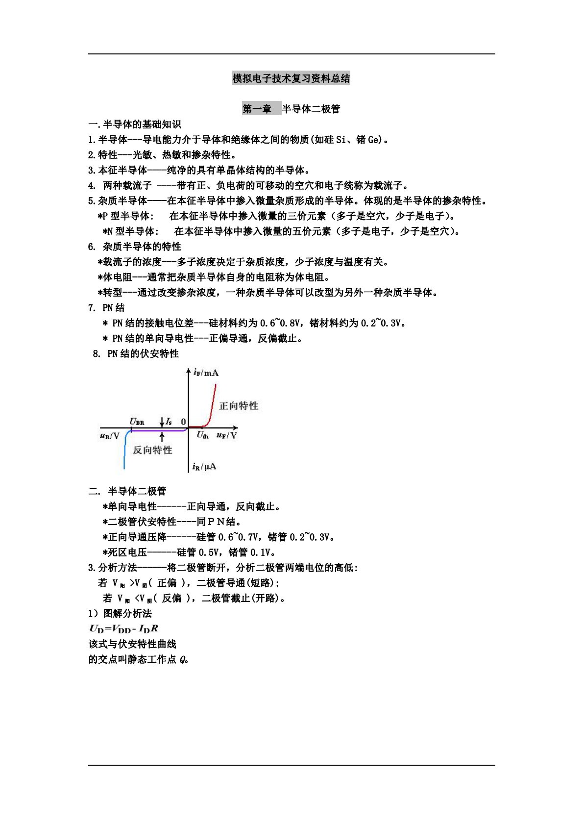 模拟电子技术复习资料总结第一章半导体二极管一.半导体的基础知识1.半导体---导电能力介于导体和绝缘体之间的物质(如硅Si、锗Ge)。2.特性---光敏、热敏和掺杂特性。3.本征半导体----纯净的具有单晶体结构的半导体。4.两种载流子----带有正、负电荷的可移动的空穴和电子统称为载流子。5.杂质半导体----在本征半导体中掺入微量杂质形成的半导体。体现的是半导体的掺杂特性。*P型半导体:在本征半导体中掺入微量的三价元素(多子是空穴,少子是电子)。*N型半导体:在本征半导体中掺入微量的五价元素(多子是电子,少子是空穴)。6.杂质半导体的特性*载流子的浓度---多子浓度决定于杂质浓度,少子浓度...