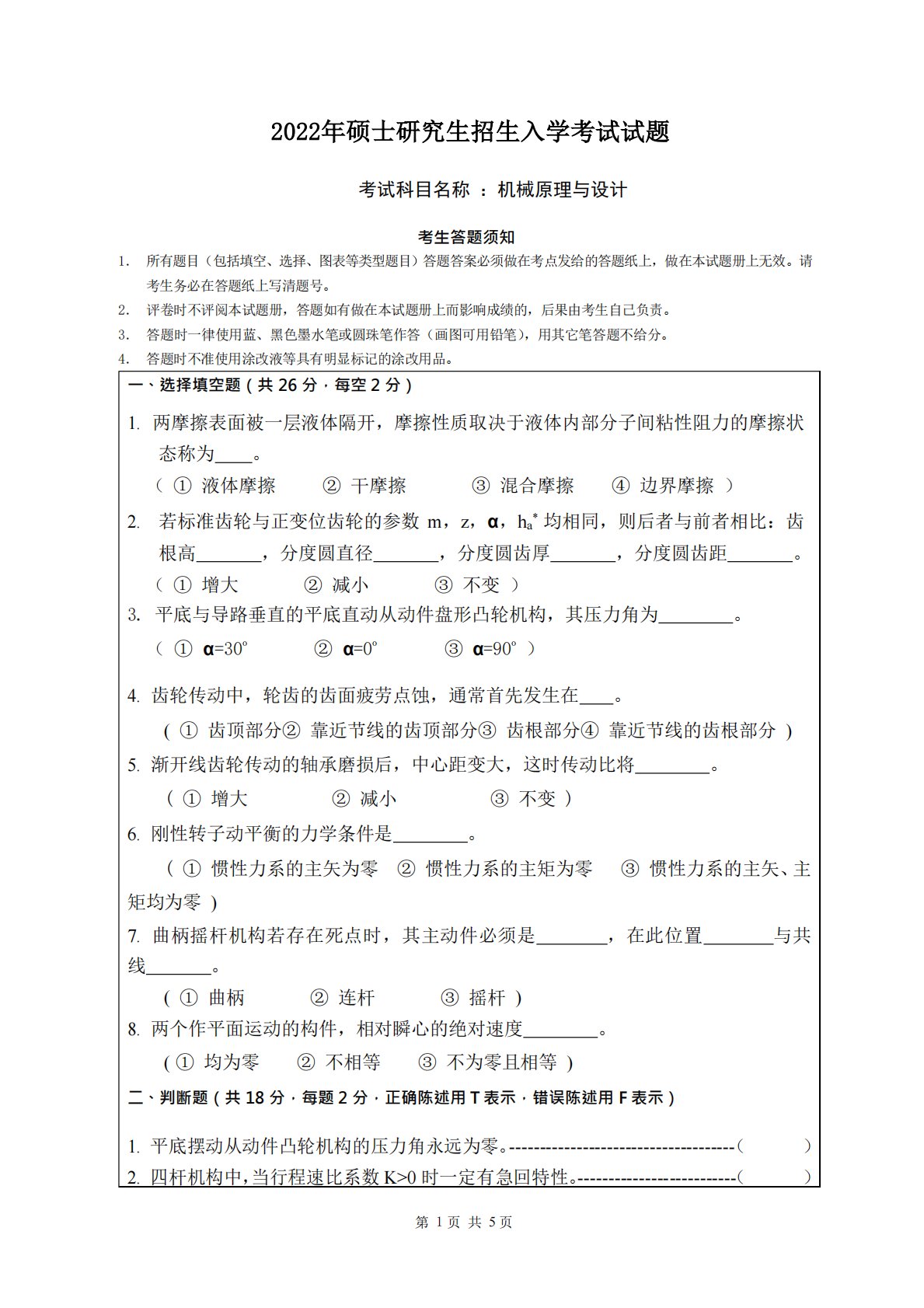 第1页共5页2022年硕士研究生招生入学考试试题考试科目名称:机械原理与设计考生答题须知1.所有题目(包括填空、选择、图表等类型题目)答题答案必须做在考点发给的答题纸上,做在本试题册上无效。请考生务必在答题纸上写清题号。2.评卷时不评阅本试题册,答题如有做在本试题册上而影响成绩的,后果由考生自己负责。3.答题时一律使用蓝、黑色墨水笔或圆珠笔作答(画图可用铅笔),用其它笔答题不给分。4.答题时不准使用涂改液等具有明显标记的涂改用品。一、选择填空题(共26分,每空2分)1.两摩擦表面被一层液体隔开,摩擦性质取决于液体内部分子间粘性阻力的摩擦状态称为。(①液体摩擦②干摩擦③混合摩擦④边界摩擦)2.若...
