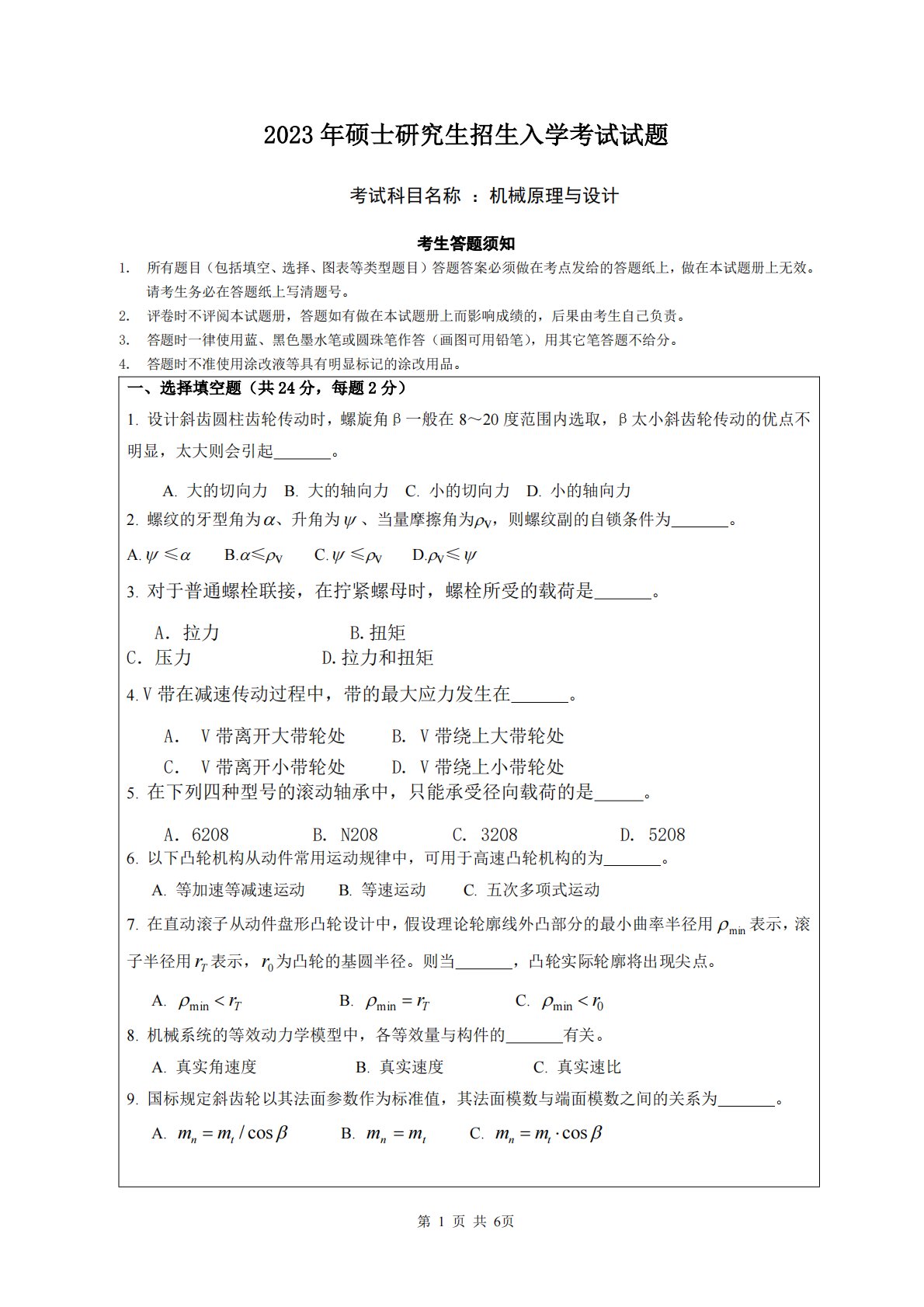 第1页共6页2023年硕士研究生招生入学考试试题考试科目名称:机械原理与设计考生答题须知1.所有题目(包括填空、选择、图表等类型题目)答题答案必须做在考点发给的答题纸上,做在本试题册上无效。请考生务必在答题纸上写清题号。2.评卷时不评阅本试题册,答题如有做在本试题册上而影响成绩的,后果由考生自己负责。3.答题时一律使用蓝、黑色墨水笔或圆珠笔作答(画图可用铅笔),用其它笔答题不给分。4.答题时不准使用涂改液等具有明显标记的涂改用品。一、选择填空题(共24分,每题2分)1.设计斜齿圆柱齿轮传动时,螺旋角β一般在8~20度范围内选取,β太小斜齿轮传动的优点不明显,太大则会引起。A.大的切向力B.大的...