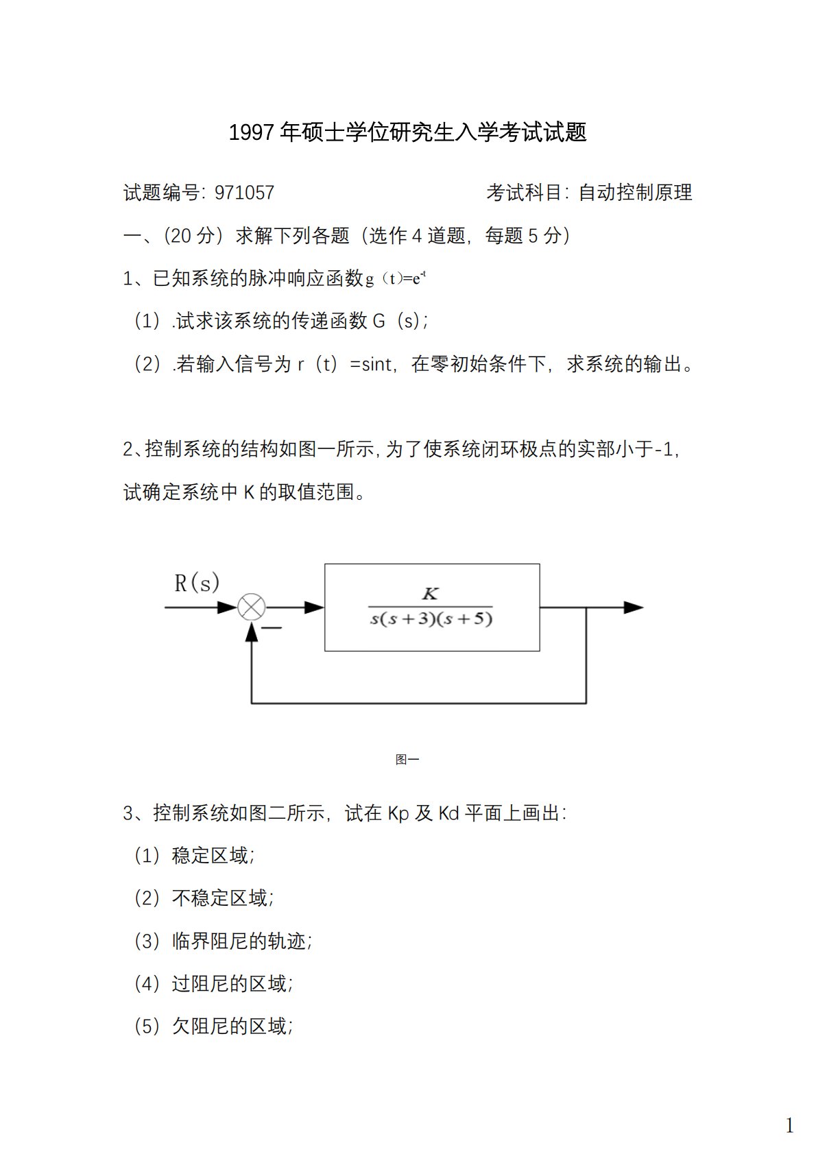 1997年硕士学位研究生入学考试试题试题编号:971057考试科目:自动控制原理一、(20分)求解下列各题(选作4道题,每题5分)1、已知系统的脉冲响应函数-tgt=e()(1).试求该系统的传递函数G(s);(2).若输入信号为r(t)=sint,在零初始条件下,求系统的输出。2、控制系统的结构如图一所示,为了使系统闭环极点的实部小于-1,试确定系统中K的取值范围。图一3、控制系统如图二所示,试在Kp及Kd平面上画出:(1)稳定区域;(2)不稳定区域;(3)临界阻尼的轨迹;(4)过阻尼的区域;(5)欠阻尼的区域;1(6)加速度误差系数Ka为40(1/2)的轨迹。图二4、已知一单位反馈...