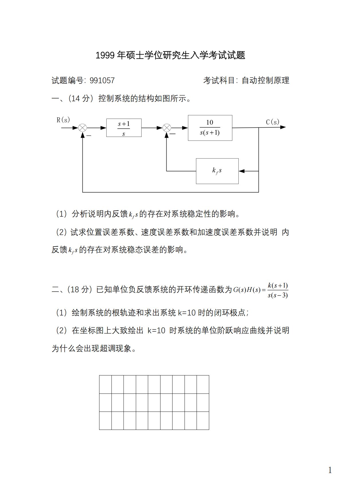 1999年硕士学位研究生入学考试试题试题编号:991057考试科目:自动控制原理一、(14分)控制系统的结构如图所示。(1)分析说明内反馈fks的存在对系统稳定性的影响。(2)试求位置误差系数、速度误差系数和加速度误差系数并说明内反馈fks的存在对系统稳态误差的影响。二、(18分)已知单位负反馈系统的开环传递函数为(1)()()(3)ksGsHsss+=−(1)绘制系统的根轨迹和求出系统k=10时的闭环极点;(2)在坐标图上大致绘出k=10时系统的单位阶跃响应曲线并说明为什么会出现超调现象。1三、(14分)设单位反馈控制系统的开环频率响应的数据如下表。ω23456810幅值7.54.83.15...
