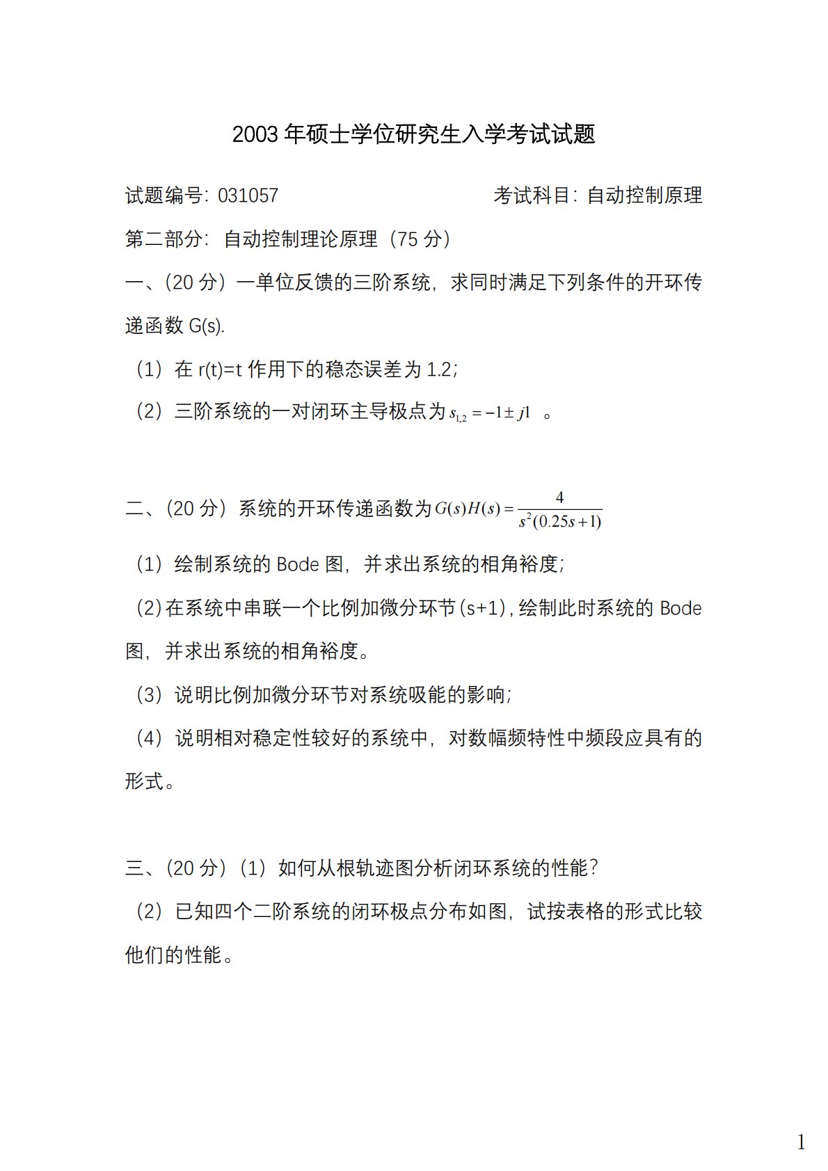 2003年硕士学位研究生入学考试试题试题编号:031057考试科目:自动控制原理第二部分:自动控制理论原理(75分)一、(20分)一单位反馈的三阶系统,求同时满足下列条件的开环传递函数G(s).(1)在r(t)=t作用下的稳态误差为1.2;(2)三阶系统的一对闭环主导极点为1,211sj=−±。二、(20分)系统的开环传递函数为24()()(0.251)GsHsss=+(1)绘制系统的Bode图,并求出系统的相角裕度;(2)在系统中串联一个比例加微分环节(s+1),绘制此时系统的Bode图,并求出系统的相角裕度。(3)说明比例加微分环节对系统吸能的影响;(4)说明相对稳定性较好的系统中,对数幅...