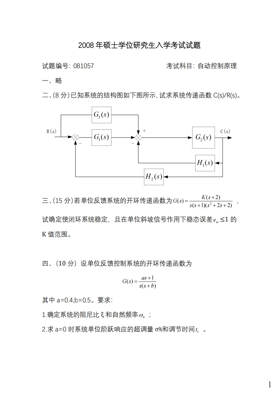 2008年硕士学位研究生入学考试试题试题编号:081057考试科目:自动控制原理一、略二、(8分)已知系统的结构图如下图所示,试求系统传递函数C(s)/R(s)。三、(15分)若单位反馈系统的开环传递函数为2(2)()(1)(22)KsGsssss+=+++,试确定使闭环系统稳定,且在单位斜坡信号作用下稳态误差sse≤1的K值范围。四、(10分)设单位反馈控制系统的开环传递函数为1()()asGsssb+=+其中a=0.4,b=0.5。要求:1.确定系统的阻尼比ξ和自然频率nω;2.求a=0时系统单位阶跃响应的超调量σ%和调节时间st。1五、(15分)设反馈控制系统的开环传递函数为:()()(...