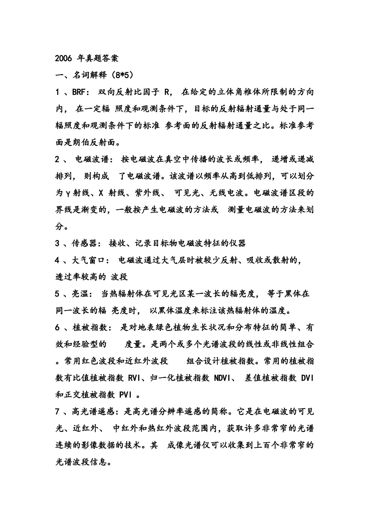 2006年真题答案一、名词解释(8*5)1、BRF:双向反射比因子R,在给定的立体角椎体所限制的方向内,在一定辐照度和观测条件下,目标的反射辐射通量与处于同一辐照度和观测条件下的标准参考面的反射辐射通量之比。标准参考面是朗伯反射面。2、电磁波谱:按电磁波在真空中传播的波长或频率,递增或递减排列,则构成了电磁波谱。该波谱以频率从高到低排列,可以划分为γ射线、X射线、紫外线、可见光、无线电波。电磁波谱区段的界线是渐变的,一般按产生电磁波的方法或测量电磁波的方法来划分。3、传感器:接收、记录目标物电磁波特征的仪器4、大气窗口:电磁波通过大气层时被较少反射、吸收或散射的,透过率较高的波段5、亮温:当热...