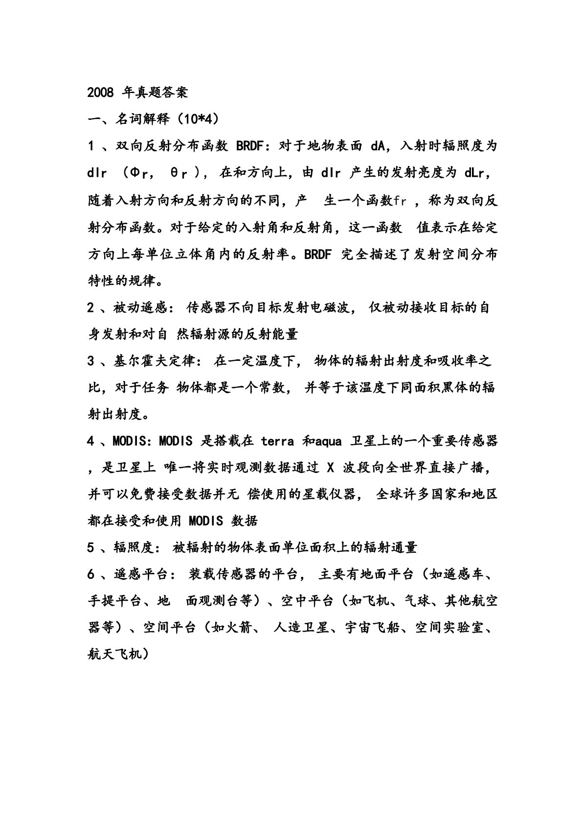 2008年真题答案一、名词解释(10*4)1、双向反射分布函数BRDF:对于地物表面dA,入射时辐照度为dIr(Φr,θr),在和方向上,由dIr产生的发射亮度为dLr,随着入射方向和反射方向的不同,产生一个函数fr,称为双向反射分布函数。对于给定的入射角和反射角,这一函数值表示在给定方向上每单位立体角内的反射率。BRDF完全描述了发射空间分布特性的规律。2、被动遥感:传感器不向目标发射电磁波,仅被动接收目标的自身发射和对自然辐射源的反射能量3、基尔霍夫定律:在一定温度下,物体的辐射出射度和吸收率之比,对于任务物体都是一个常数,并等于该温度下同面积黑体的辐射出射度。4、MODIS:MODIS是...