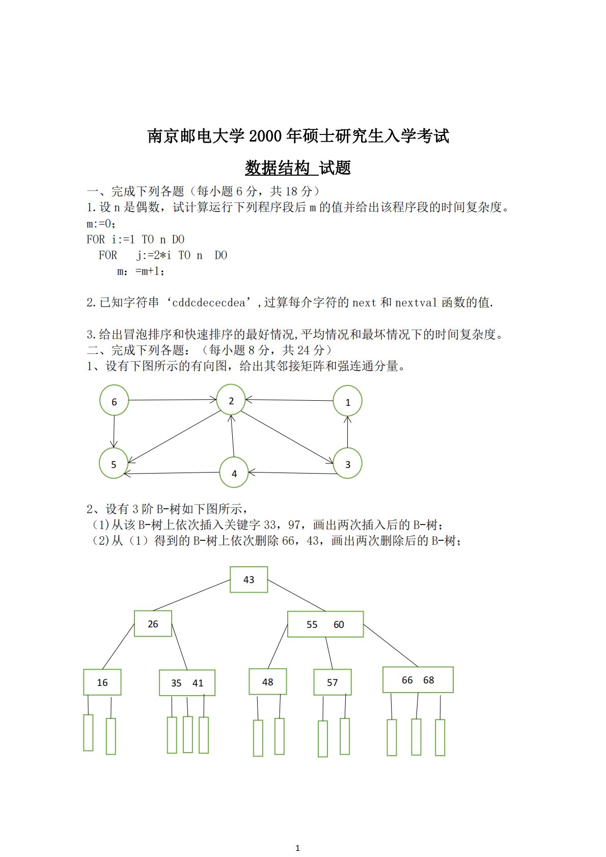 1南京邮电大学2000年硕士研究生入学考试数据结构试题一、完成下列各题(每小题6分,共18分)1.设n是偶数,试计算运行下列程序段后m的值并给出该程序段的时间复杂度。m:=0;FORi:=1TOnDOFORj:=2*iTOnDOm:=m+1;2.已知字符串‘cddcdececdea’,过算每介字符的next和nextval函数的值.3.给出冒泡排序和快速排序的最好情况,平均情况和最坏情况下的时间复杂度。二、完成下列各题:(每小题8分,共24分)1、设有下图所示的有向图,给出其邻接矩阵和强连通分量。2、设有3阶B-树如下图所示,(1)从该B-树上依次插入关键字33,97,画出两次插入后的B-树;...