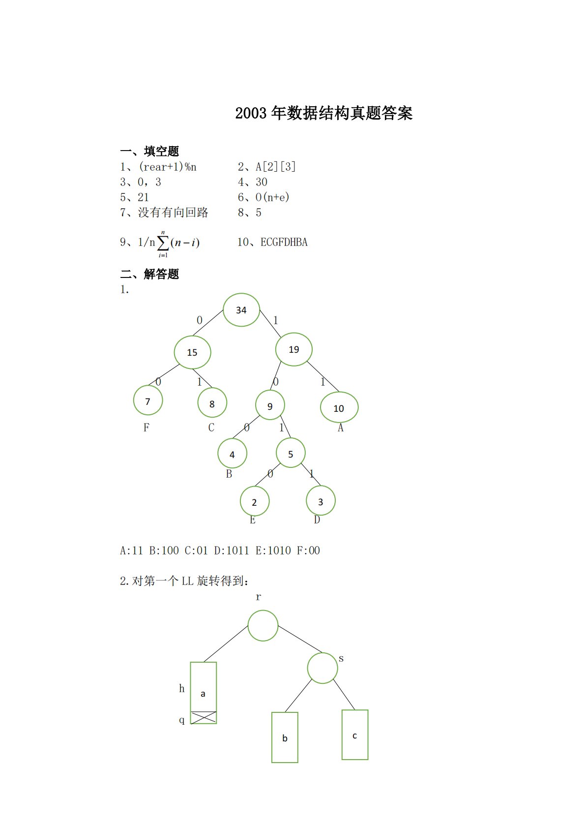 2003年数据结构真题答案2、A[2][3]4、306、O(n+e)8、5n(n−i)i=110、ECGFDHBA一、填空题1、(rear+1)%n3、0,35、217、没有有向回路9、1/n二、解答题1.0101FC01AB01EDA:11B:100C:01D:1011E:1010F:002.对第一个LL旋转得到:rshq34011519789105432acb对第二个RL旋转得到:usrhhh-1hq3.(1)632435(2)O(n+m)r4r3r1r230164255、(1)6816919881210169191210888696221524162118914(3)快速排序最好情况:...