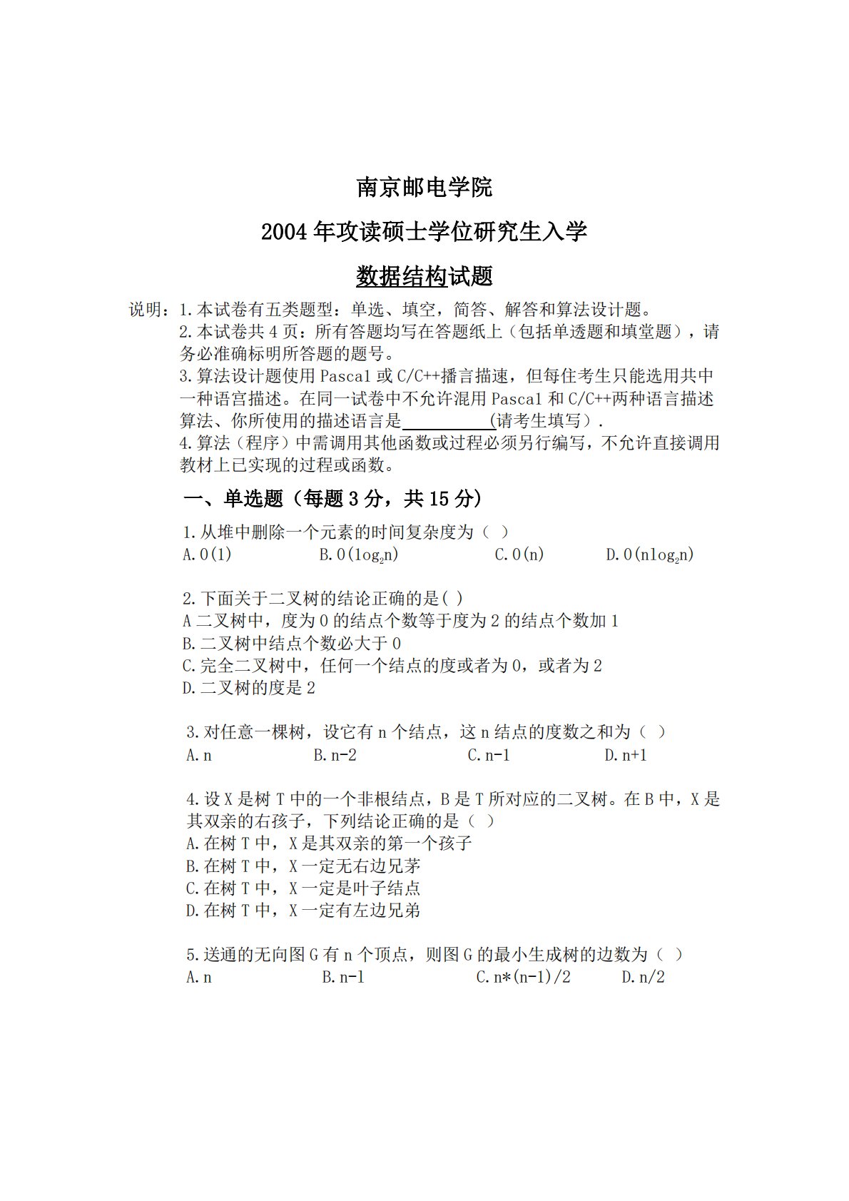 南京邮电学院2004年攻读硕士学位研究生入学数据结构试题说明:1.本试卷有五类题型:单选、填空,简答、解答和算法设计题。2.本试卷共4页:所有答题均写在答题纸上(包括单透题和填堂题),请务必准确标明所答题的题号。3.算法设计题使用Pasca1或C/C++播言描速,但每住考生只能选用共中一种语宫描述。在同一试卷中不允许混用Pasca1和C/C++两种语言描述算法、你所使用的描述语言是(请考生填写).4.算法(程序)中需调用其他函数或过程必须另行编写,不允许直接调用教材上已实现的过程或函数。一、单选题(每题3分,共15分)1.从堆中删除一个元素的时间复杂度为()A.0(1)B.0(1og2n)C....