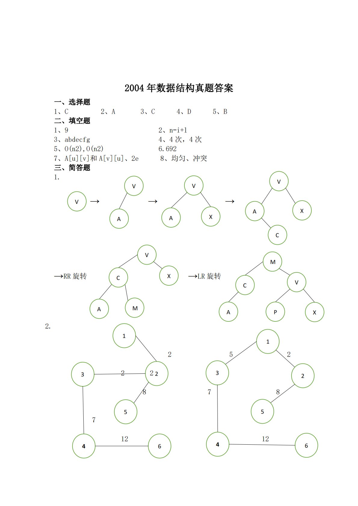 2004年数据结构真题答案2、A3、C4、D5、B一、选择题1、C二、填空题1、93、abdecfg2、n-i+l4、4次,4次6.6928、均匀、冲突5、O(n2),O(n2)7、A[u][v]和A[v][u]、2e三、简答题1.→→→→RR旋转→LR旋转2.25287812126VVVXAXAAVCVMXVCCXPAMA112322235574643.(1)012004101130226∞0(2)(3)是强连通图4.Distance[i]Path[i]5.快排合适于数据量大(上百万)的情形,而插入排序适合于小数据量的(1)情形。(2)最坏O(n2),平均O(nlog2n)(3)因为快速排序...