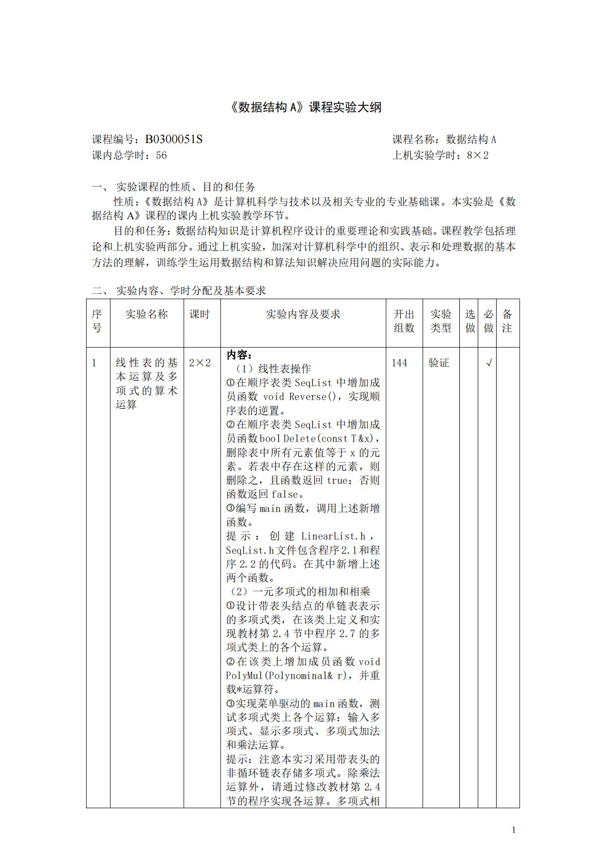 1《数据结构A》课程实验大纲课程编号:B0300051S课内总学时:56课程名称:数据结构A上机实验学时:8×2一、实验课程的性质、目的和任务性质:《数据结构A》是计算机科学与技术以及相关专业的专业基础课。本实验是《数据结构A》课程的课内上机实验教学环节。目的和任务:数据结构知识是计算机程序设计的重要理论和实践基础。课程教学包括理论和上机实验两部分。通过上机实验,加深对计算机科学中的组织、表示和处理数据的基本方法的理解,训练学生运用数据结构和算法知识解决应用问题的实际能力。二、实验内容、学时分配及基本要求序号实验名称课时实验内容及要求开出组数实验类型选做必做备注1线性表的基本运算及多项式的算术...