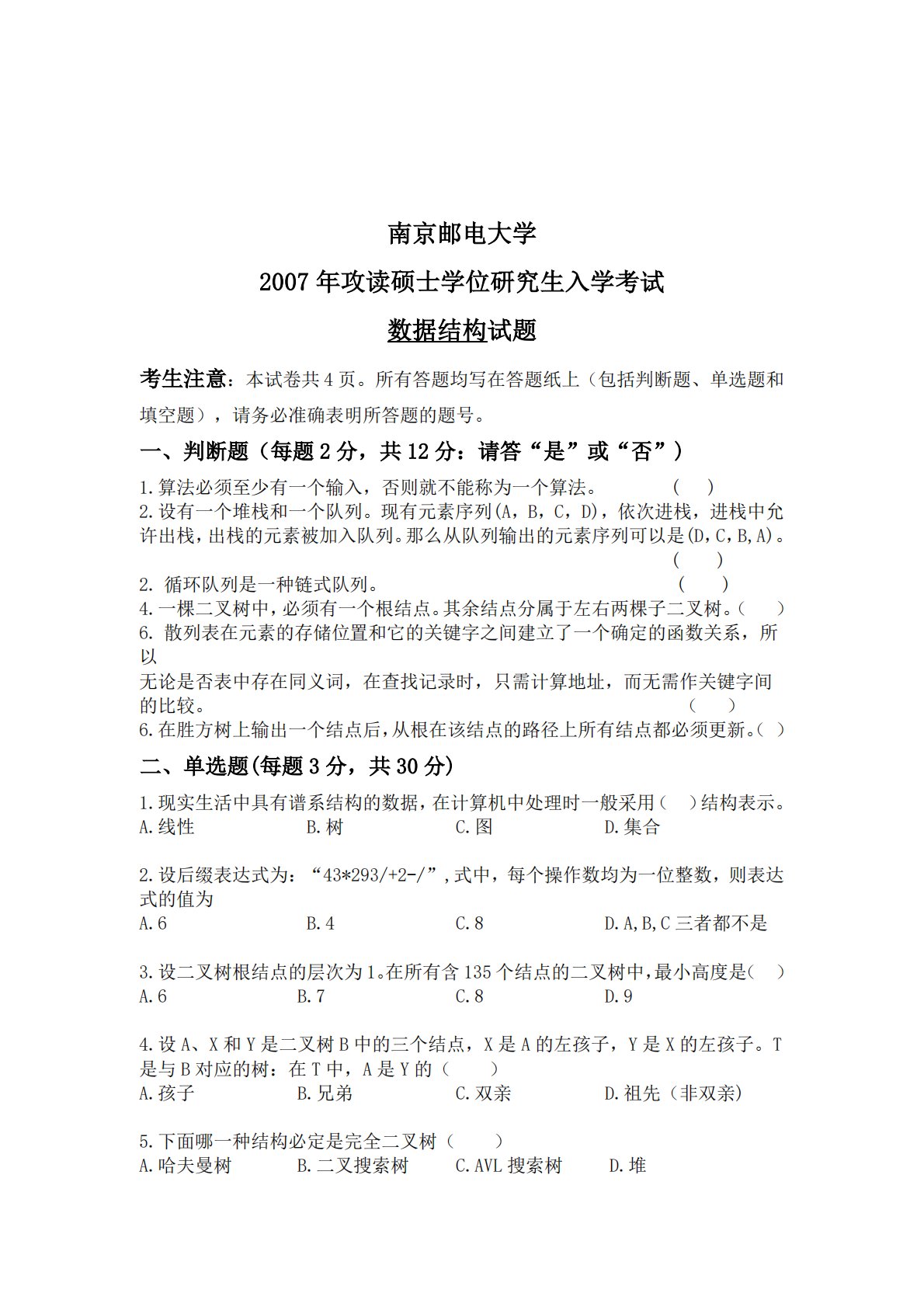 南京邮电大学2007年攻读硕士学位研究生入学考试数据结构试题考生注意:本试卷共4页。所有答题均写在答题纸上(包括判断题、单选题和填空题),请务必准确表明所答题的题号。一、判断题(每题2分,共12分:请答“是”或“否”)1.算法必须至少有一个输入,否则就不能称为一个算法。()2.设有一个堆栈和一个队列。现有元素序列(A,B,C,D),依次进栈,进栈中允许出栈,出栈的元素被加入队列。那么从队列输出的元素序列可以是(D,C,B,A)。()2.循环队列是一种链式队列。())4.一棵二叉树中,必须有一个根结点。其余结点分属于左右两棵子二叉树。(6.散列表在元素的存储位置和它的关键字之间建立了一个确定的函...