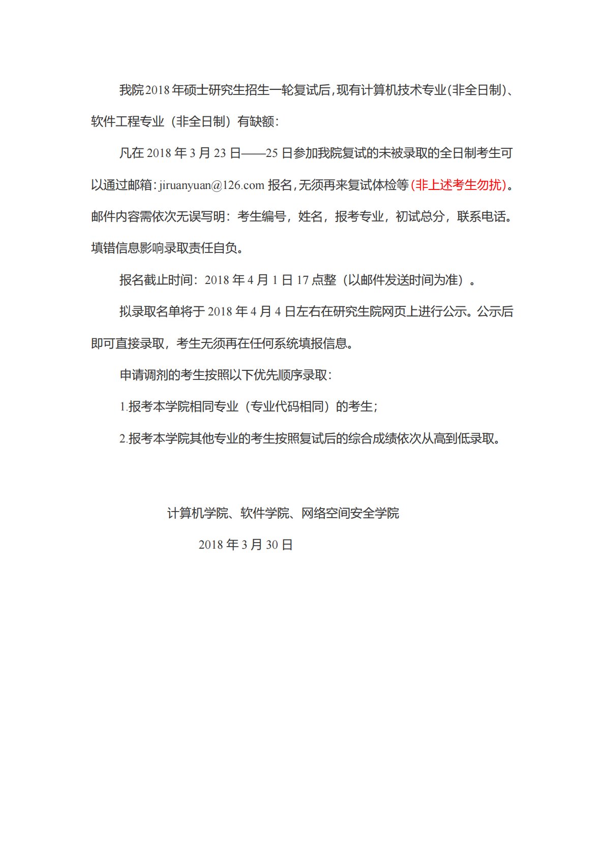 我院2018年硕士研究生招生一轮复试后,现有计算机技术专业(非全日制)、软件工程专业(非全日制)有缺额:凡在2018年3月23日——25日参加我院复试的未被录取的全日制考生可以通过邮箱:jiruanyuan@126.com报名,无须再来复试体检等(非上述考生勿扰)。邮件内容需依次无误写明:考生编号,姓名,报考专业,初试总分,联系电话。填错信息影响录取责任自负。报名截止时间:2018年4月1日17点整(以邮件发送时间为准)。拟录取名单将于2018年4月4日左右在研究生院网页上进行公示。公示后即可直接录取,考生无须再在任何系统填报信息。申请调剂的考生按照以下优先顺序录取:1.报考本学院相同专业(专...