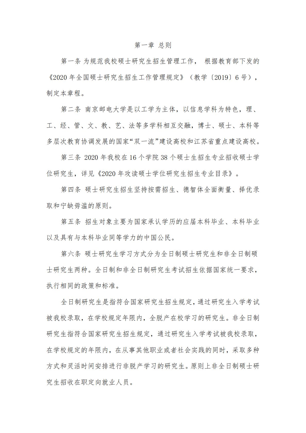 第一章总则第一条为规范我校硕士研究生招生管理工作,根据教育部下发的《2020年全国硕士研究生招生工作管理规定》(教学〔2019〕6号),制定本章程。第二条南京邮电大学是以工学为主体,以信息学科为特色,理、工、经、管、文、教、艺、法等多学科相互交融,博士、硕士、本科等多层次教育协调发展的国家“双一流”建设高校和江苏省重点建设高校。第三条2020年我校在16个学院38个硕士生招生专业招收硕士学位研究生,详见《2020年攻读硕士学位研究生招生专业目录》。第四条硕士研究生招生坚持按需招生、德智体全面衡量、择优录取和宁缺毋滥的原则。第五条招生对象主要为国家承认学历的应届本科毕业、本科毕业以及具有与本科毕...
