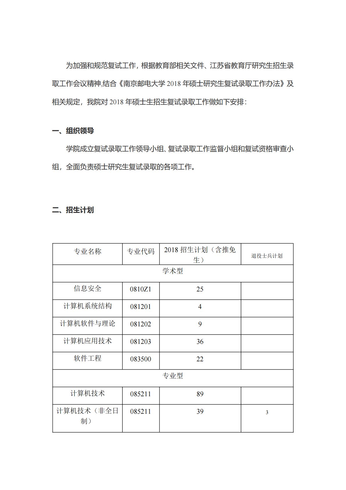 为加强和规范复试工作,根据教育部相关文件、江苏省教育厅研究生招生录取工作会议精神,结合《南京邮电大学2018年硕士研究生复试录取工作办法》及相关规定,我院对2018年硕士生招生复试录取工作做如下安排:一、组织领导学院成立复试录取工作领导小组、复试录取工作监督小组和复试资格审查小组,全面负责硕士研究生复试录取的各项工作。二、招生计划专业名称专业代码2018招生计划(含推免生)退役士兵计划学术型信息安全0810Z125计算机系统结构0812014计算机软件与理论0812029计算机应用技术08120336软件工程08350022专业型计算机技术08521189计算机技术(非全日制)08521139...