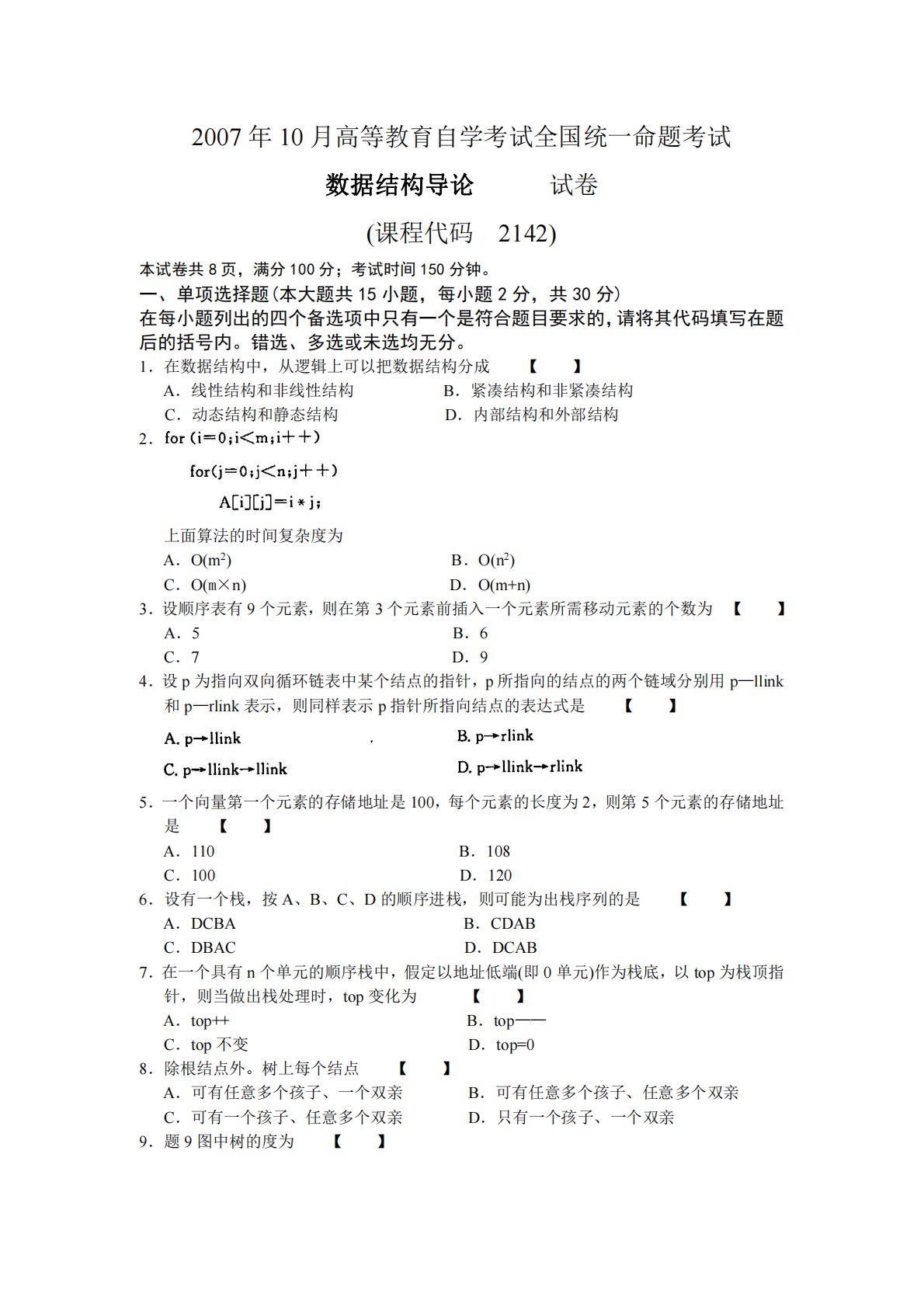 2007年10月高等教育自学考试全国统一命题考试数据结构导论试卷(课程代码2142)本试卷共8页,满分100分;考试时间150分钟。一、单项选择题(本大题共15小题,每小题2分,共30分)在每小题列出的四个备选项中只有一个是符合题目要求的,请将其代码填写在题后的括号内。错选、多选或未选均无分。1.在数据结构中,从逻辑上可以把数据结构分成【】A.线性结构和非线性结构B.紧凑结构和非紧凑结构C.动态结构和静态结构D.内部结构和外部结构2.上面算法的时间复杂度为A.O(m2)B.O(n2)C.O(m×n)D.O(m+n)3.设顺序表有9个元素,则在第3个元素前插入一个元素所需移动元素的个数为【】A....