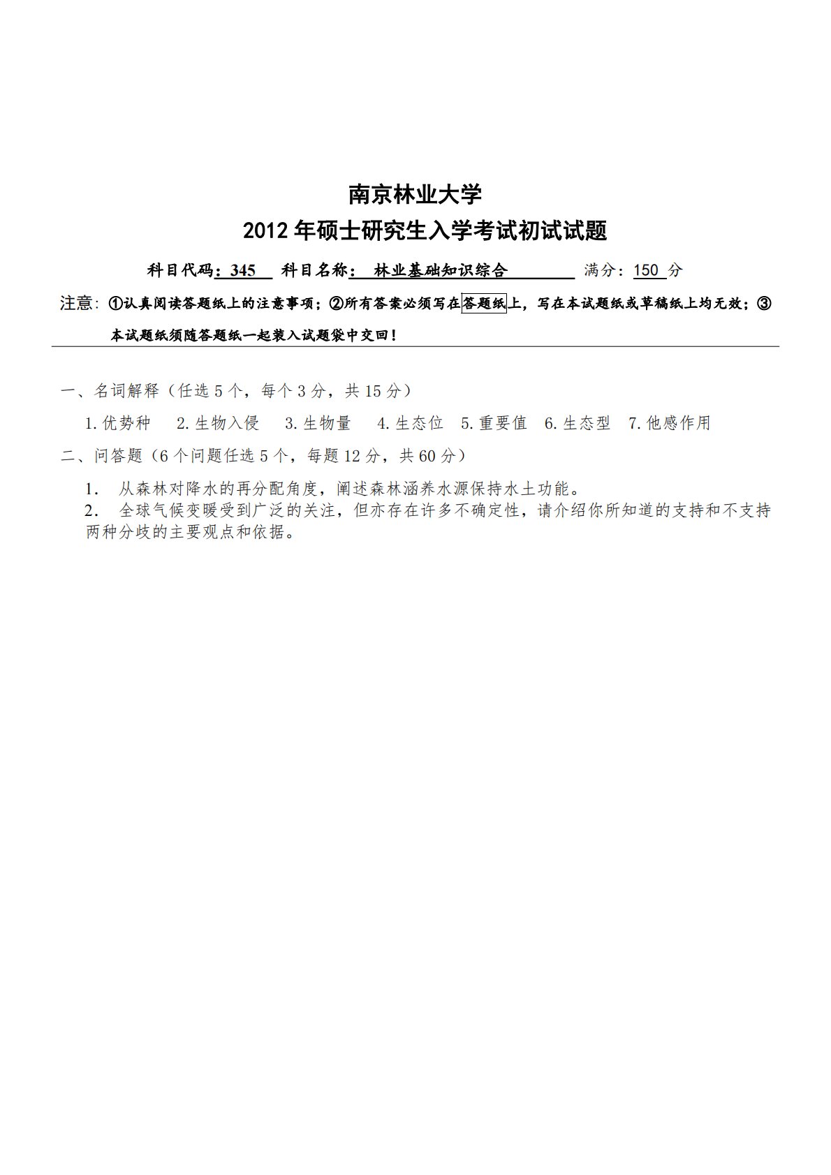 南京林业大学2012年硕士研究生入学考试初试试题科目代码:345科目名称:林业基础知识综合满分:150分注意:①认真阅读答题纸上的注意事项;②所有答案必须写在答题纸上,写在本试题纸或草稿纸上均无效;③本试题纸须随答题纸一起装入试题袋中交回!一、名词解释(任选5个,每个3分,共15分)1.优势种2.生物入侵3.生物量4.生态位5.重要值6.生态型7.他感作用二、问答题(6个问题任选5个,每题12分,共60分)1.从森林对降水的再分配角度,阐述森林涵养水源保持水土功能。2.全球气候变暖受到广泛的关注,但亦存在许多不确定性,请介绍你所知道的支持和不支持两种分歧的主要观点和依据。南京林业大学2012年...