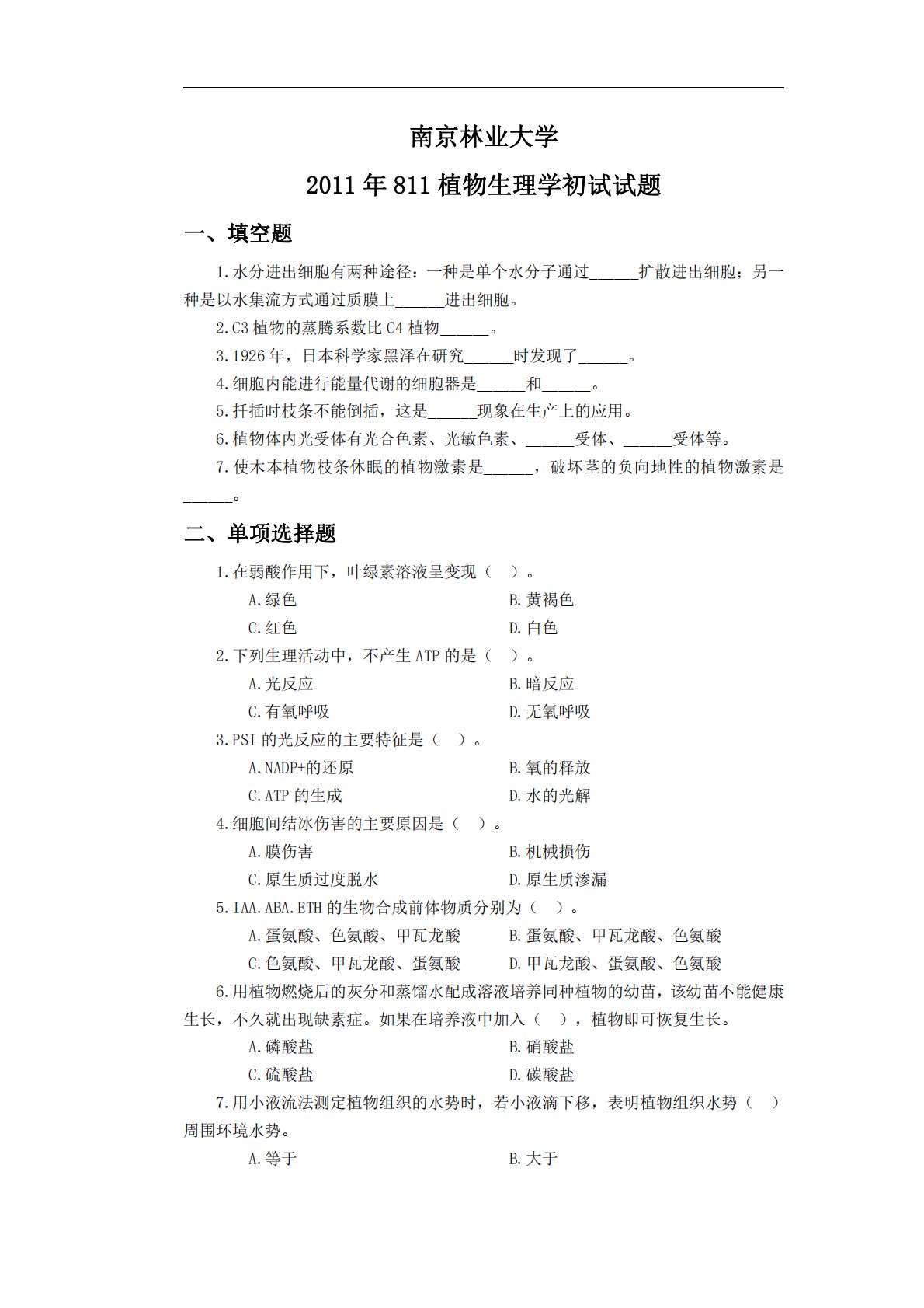 南京林业大学2011年811植物生理学初试试题一、填空题1.水分进出细胞有两种途径:一种是单个水分子通过______扩散进出细胞;另一种是以水集流方式通过质膜上______进出细胞。2.C3植物的蒸腾系数比C4植物______。3.1926年,日本科学家黑泽在研究______时发现了______。4.细胞内能进行能量代谢的细胞器是______和______。5.扦插时枝条不能倒插,这是______现象在生产上的应用。6.植物体内光受体有光合色素、光敏色素、______受体、______受体等。7.使木本植物枝条休眠的植物激素是______,破坏茎的负向地性的植物激素是______。二、单项选择...
