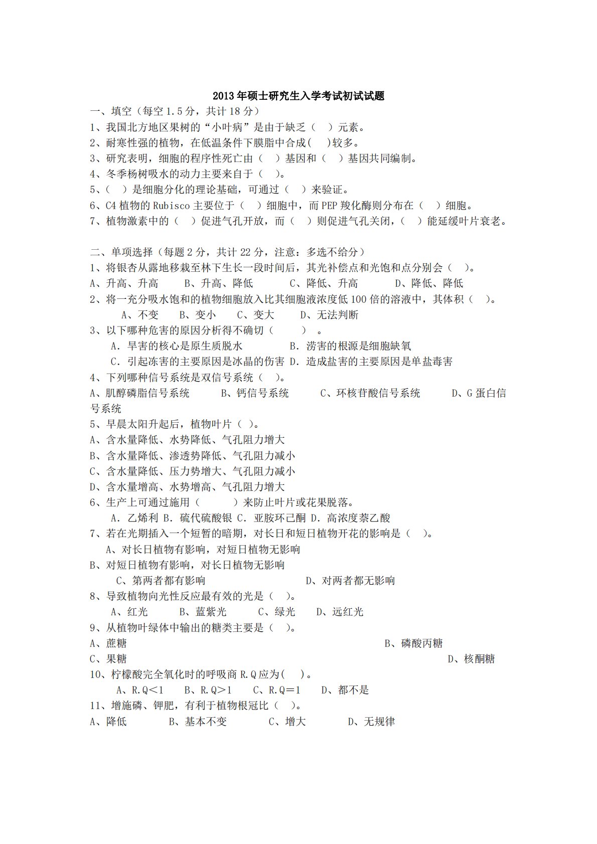 2013年硕士研究生入学考试初试试题一、填空(每空1.5分,共计18分)1、我国北方地区果树的“小叶病”是由于缺乏()元素。2、耐寒性强的植物,在低温条件下膜脂中合成()较多。3、研究表明,细胞的程序性死亡由()基因和()基因共同编制。4、冬季杨树吸水的动力主要来自于()。5、()是细胞分化的理论基础,可通过()来验证。6、C4植物的Rubisco主要位于()细胞中,而PEP羧化酶则分布在()细胞。7、植物激素中的()促进气孔开放,而()则促进气孔关闭,()能延缓叶片衰老。二、单项选择(每题2分,共计22分,注意:多选不给分)1、将银杏从露地移栽至林下生长一段时间后,其光补偿点和光饱和点分别会...