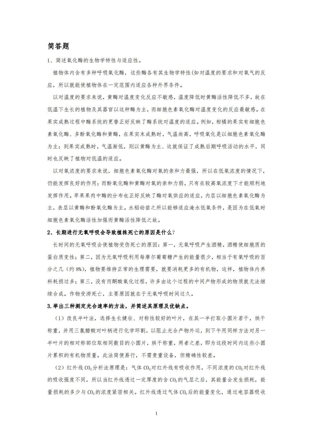 1简答题1、简述氧化酶的生物学特性与适应性。植物体内含有多种呼吸氧化酶,这些酶各有其生物学特性(如对温度的要求和对氧气的反应,所以就能使植物体在一定范围内适应各种外界条件。以对温度的要求来说,黄酶对温度变化反应不敏感,温度降低时黄酶活性降低不多,故在低温下生长的植物及其器官以这种酶为主,而细胞色素氧化酶对温度变化的反应最敏感。在果实成熟过程中酶系统的更替正好反映了酶系统对温度的适应。例如,柑橘的果实有细胞色素氧化酶、多酚氧化酶和黄酶,在果实末成熟时,气温尚高,呼吸氧化是以细胞色素氧化酶为主;到果实成熟时,气温渐低,则以黄酶为主.这就保证了成熟后期呼吸活动的水平,同时也反映了植物对低温的适应。以...
