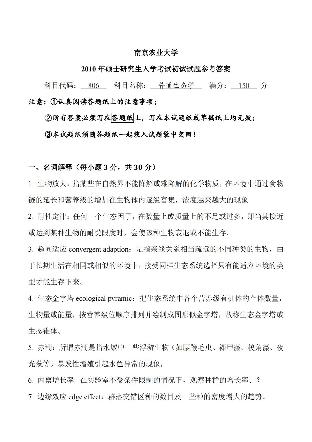南京农业大学2010年硕士研究生入学考试初试试题参考答案科目代码:806科目名称:普通生态学满分:150分注意:①认真阅读答题纸上的注意事项;②所有答案必须写在答题纸上,写在本试题纸或草稿纸上均无效;③本试题纸须随答题纸一起装入试题袋中交回!一、名词解释(每小题3分,共30分)1.生物放大:指某些在自然界不能降解或难降解的化学物质,在环境中通过食物链的延长和营养级的增加在生物体内逐级富集,浓度越来越大的现象2.耐性定律:任何一个生态因子,在数量上或质量上的不足或过多,即当其接近或达到某种生物的耐受限度时,会使该种生物衰退或不能生存。3.趋同适应convergentadaption:是指亲缘关系...