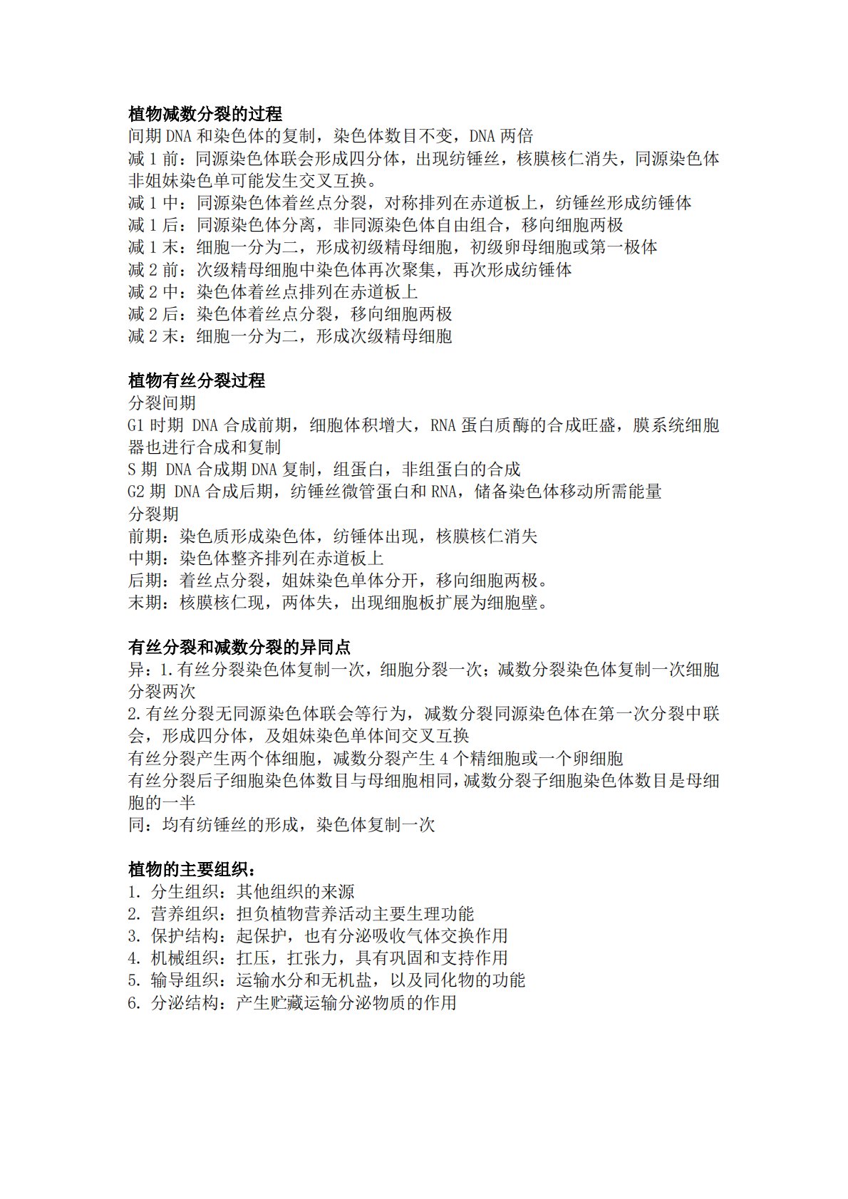植物减数分裂的过程间期DNA和染色体的复制,染色体数目不变,DNA两倍减1前:同源染色体联会形成四分体,出现纺锤丝,核膜核仁消失,同源染色体非姐妹染色单可能发生交叉互换。减1中:同源染色体着丝点分裂,对称排列在赤道板上,纺锤丝形成纺锤体减1后:同源染色体分离,非同源染色体自由组合,移向细胞两极减1末:细胞一分为二,形成初级精母细胞,初级卵母细胞或第一极体减2前:次级精母细胞中染色体再次聚集,再次形成纺锤体减2中:染色体着丝点排列在赤道板上减2后:染色体着丝点分裂,移向细胞两极减2末:细胞一分为二,形成次级精母细胞植物有丝分裂过程分裂间期G1时期DNA合成前期,细胞体积增大,RNA蛋白质酶的合成...