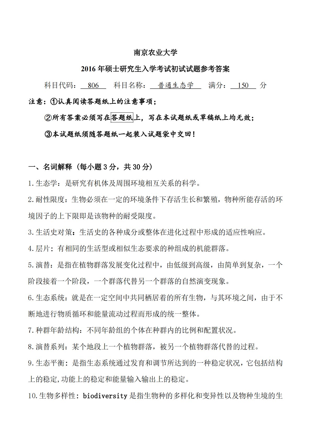 南京农业大学2016年硕士研究生入学考试初试试题参考答案科目代码:806科目名称:普通生态学满分:150分注意:①认真阅读答题纸上的注意事项;②所有答案必须写在答题纸上,写在本试题纸或草稿纸上均无效;③本试题纸须随答题纸一起装入试题袋中交回!一、名词解释(每小题3分,共30分)1.生态学:是研究有机体及周围环境相互关系的科学。2.耐性限度:生物必须在一定的环境条件下存活生长和繁殖,物种所能存活的环境因子的上下限即是该物种的耐受限度。3.生活史对策:生活史的各种成分或整体在进化过程中形成的适应性响应。4.层片:有相同的生活型或相似生态要求的种组成的机能群落。5.演替:是指在植物群落发展变化过程中...