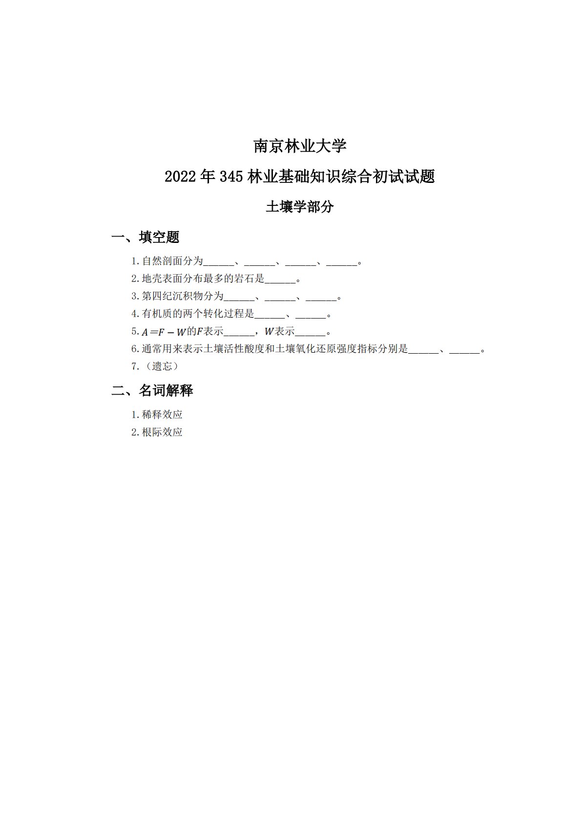 南京林业大学2022年345林业基础知识综合初试试题土壤学部分一、填空题1.自然剖面分为______、______、______、______。2.地壳表面分布最多的岩石是______。3.第四纪沉积物分为______、______、______。4.有机质的两个转化过程是______、______。5.=−的表示______,表示______。6.通常用来表示土壤活性酸度和土壤氧化还原强度指标分别是______、______。7.(遗忘)二、名词解释1.稀释效应2.根际效应南京林业大学2022年345林业基础知识综合初试试题土壤学部分一、填空题1.自然剖面分为______、____...