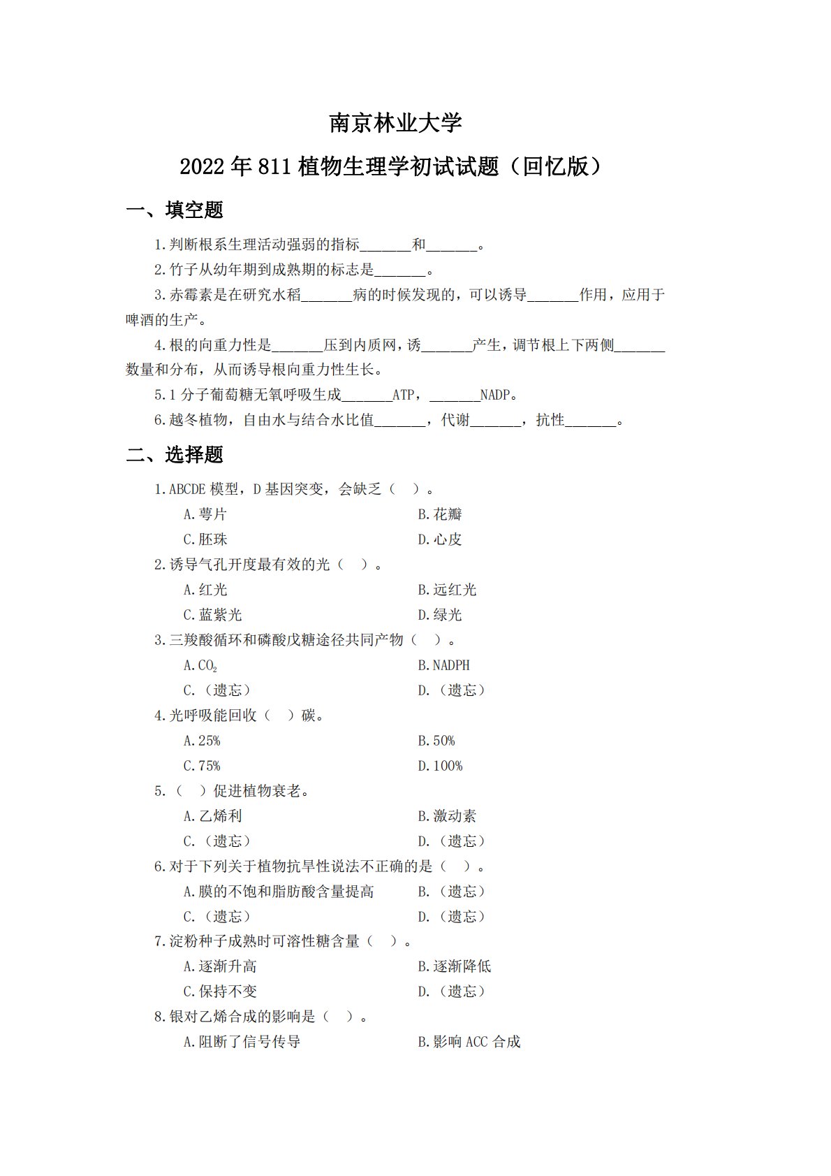 南京林业大学2022年811植物生理学初试试题(回忆版)一、填空题1.判断根系生理活动强弱的指标_______和_______。2.竹子从幼年期到成熟期的标志是_______。3.赤霉素是在研究水稻_______病的时候发现的,可以诱导_______作用,应用于啤酒的生产。4.根的向重力性是_______压到内质网,诱_______产生,调节根上下两侧_______数量和分布,从而诱导根向重力性生长。5.1分子葡萄糖无氧呼吸生成_______ATP,_______NADP。6.越冬植物,自由水与结合水比值_______,代谢_______,抗性_______。二、选择题1.ABCDE模型,D基...