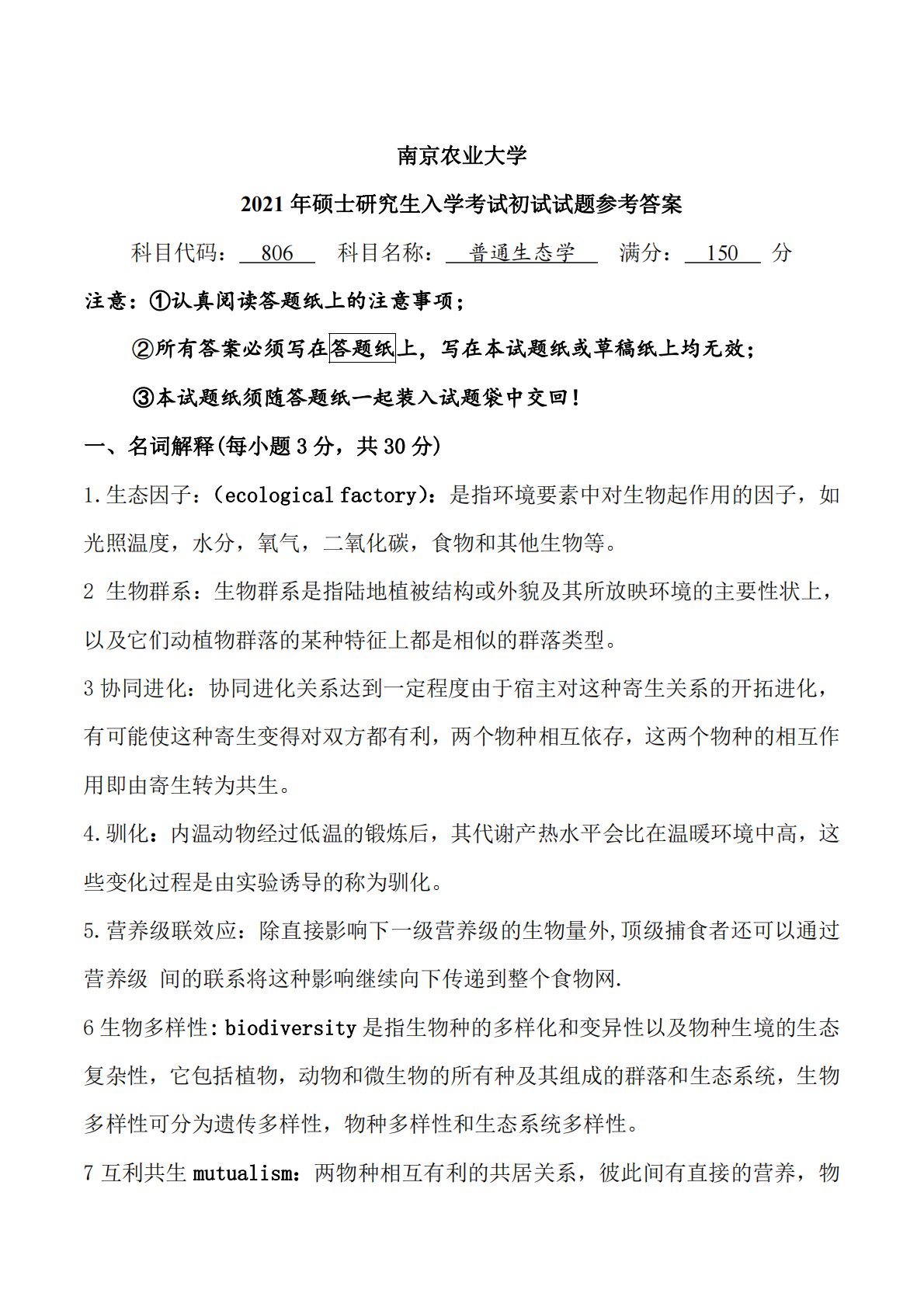 南京农业大学2021年硕士研究生入学考试初试试题参考答案科目代码:806科目名称:普通生态学满分:150分注意:①认真阅读答题纸上的注意事项;②所有答案必须写在答题纸上,写在本试题纸或草稿纸上均无效;③本试题纸须随答题纸一起装入试题袋中交回!一、名词解释(每小题3分,共30分)1.生态因子:(ecologicalfactory):是指环境要素中对生物起作用的因子,如光照温度,水分,氧气,二氧化碳,食物和其他生物等。2生物群系:生物群系是指陆地植被结构或外貌及其所放映环境的主要性状上,以及它们动植物群落的某种特征上都是相似的群落类型。3协同进化:协同进化关系达到一定程度由于宿主对这种寄生关系的开...