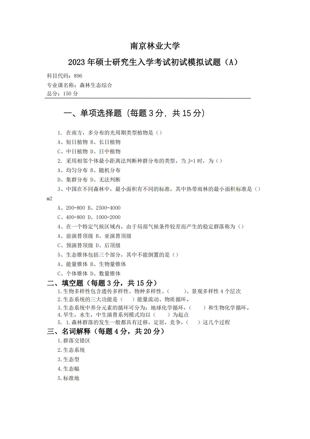 南京林业大学2023年硕士研究生入学考试初试模拟试题(A)科目代码:896专业课名称:森林生态综合总分:150分一、单项选择题(每题3分,共15分)1.在南方,多分布的光周期类型植物是()A、短日植物B、长日植物C、中日植物D、日中植物2.采用相邻个体最小距离法判断种群分布的类型,当J=1时,为()A、均匀分布B、随机分布D、集群分布D、无法判断3、中国在不同森林中,最小面积有不同的标准,其中热带雨林的最小面积标准是()m2A、200-800B、2500-4000C、400-800D、1000-20004、在一个特定气候区域内,由于局部气候条件较差而产生的稳定群落称为()A、前演替顶级B、亚演...
