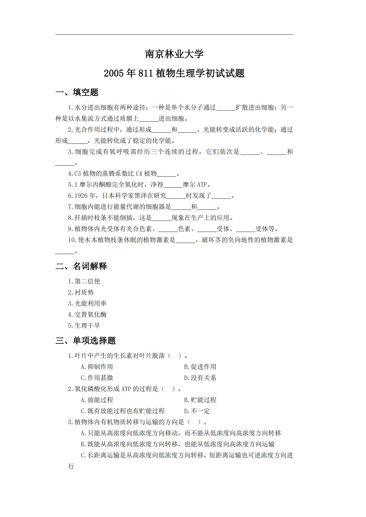 一、填空南京林业大学2005年811植物生理学初试试题题1.水分进出细胞有两种途径:一种是单个水分子通过______扩散进出细胞;另一种是以水集流方式通过质膜上______进出细胞。2.光合作用过程中,通过形成______和______,光能转变成活跃的化学能;通过形成______,光能转化成了稳定的化学能。3.细胞完成有氧呼吸需经历三个连续的过程,它们依次是______、______和______。4.C3植物的蒸腾系数比C4植物______。5.1摩尔丙酮酸完全氧化时,净得______摩尔ATP。6.1926年,日本科学家黑泽在研究______时发现了______。7.细胞内能进行能量代谢...