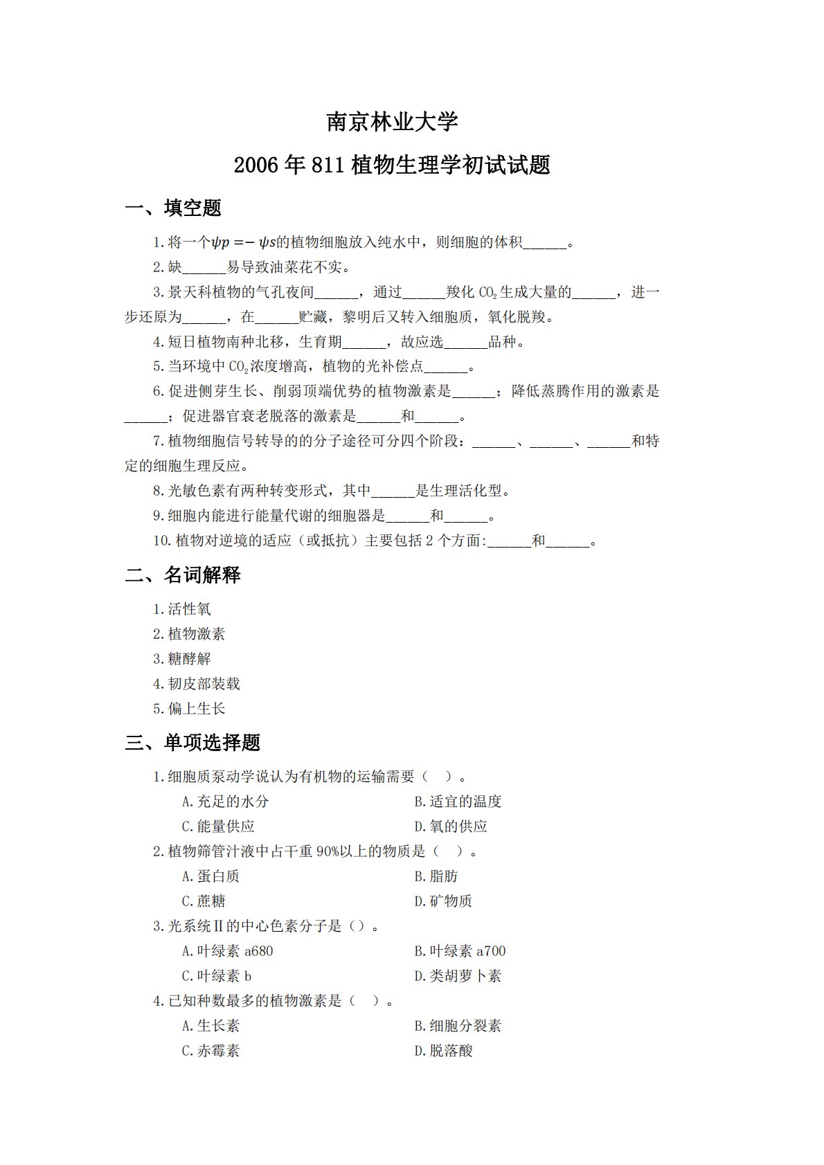 南京林业大学2006年811植物生理学初试试题一、填空题1.将一个=−的植物细胞放入纯水中,则细胞的体积______。2.缺______易导致油菜花不实。3.景天科植物的气孔夜间______,通过______羧化CO2生成大量的______,进一步还原为______,在______贮藏,黎明后又转入细胞质,氧化脱羧。4.短日植物南种北移,生育期______,故应选______品种。5.当环境中CO2浓度增高,植物的光补偿点______。6.促进侧芽生长、削弱顶端优势的植物激素是______;降低蒸腾作用的激素是______;促进器官衰老脱落的激素是______和______。7.植物细...