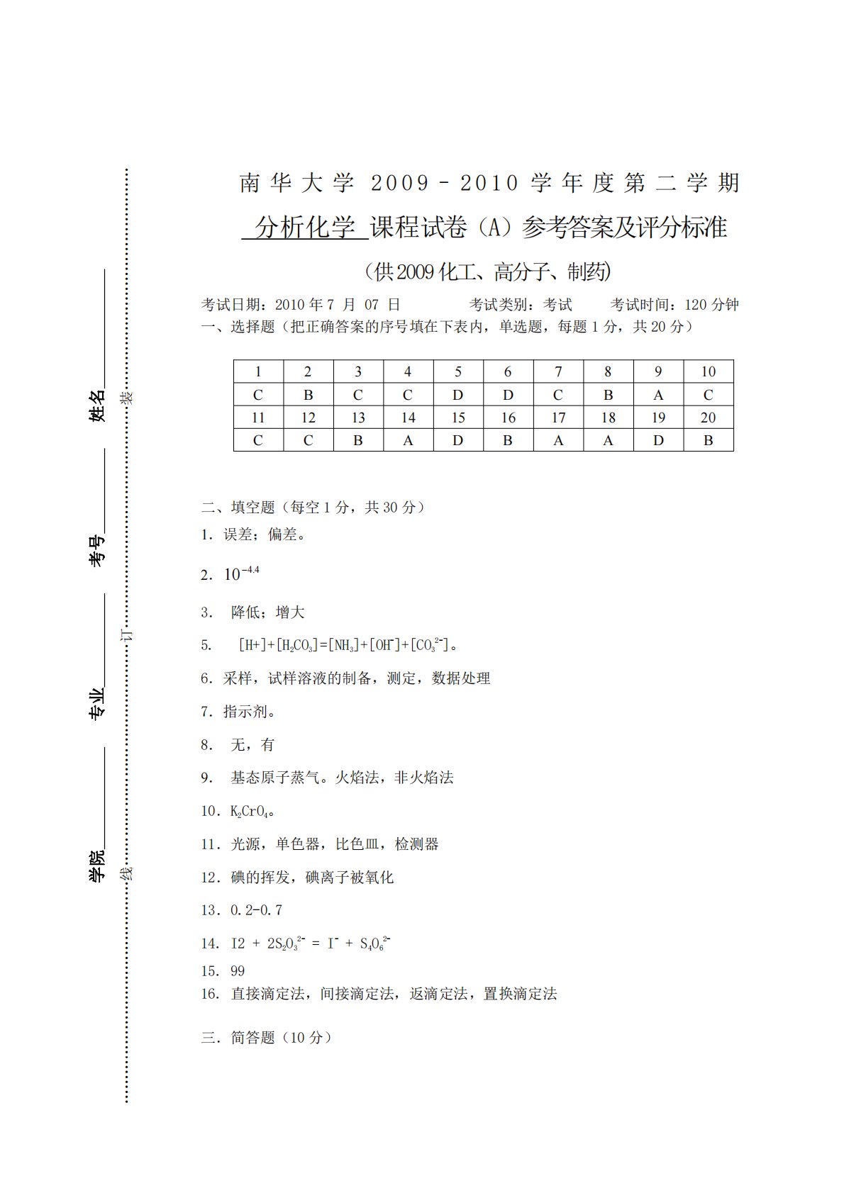 南华大学2009–2010学年度第二学期分析化学课程试卷(A)参考答案及评分标准(供2009化工、高分子、制药)考试日期:2010年7月07日考试类别:考试考试时间:120分钟一、选择题(把正确答案的序号填在下表内,单选题,每题1分,共20分)12345678910CBCCDDCBAC11121314151617181920CCBADBAADB二、填空题(每空1分,共30分)1.误差;偏差。2.4.4103.降低;增大5.[H+]+[H2CO3]=[NH3]+[OH-]+[CO32-]。6.采样,试样溶液的制备,测定,数据处理7.指示剂。8.无,有9.基态原子蒸气。火焰法,非火焰法10.K2...