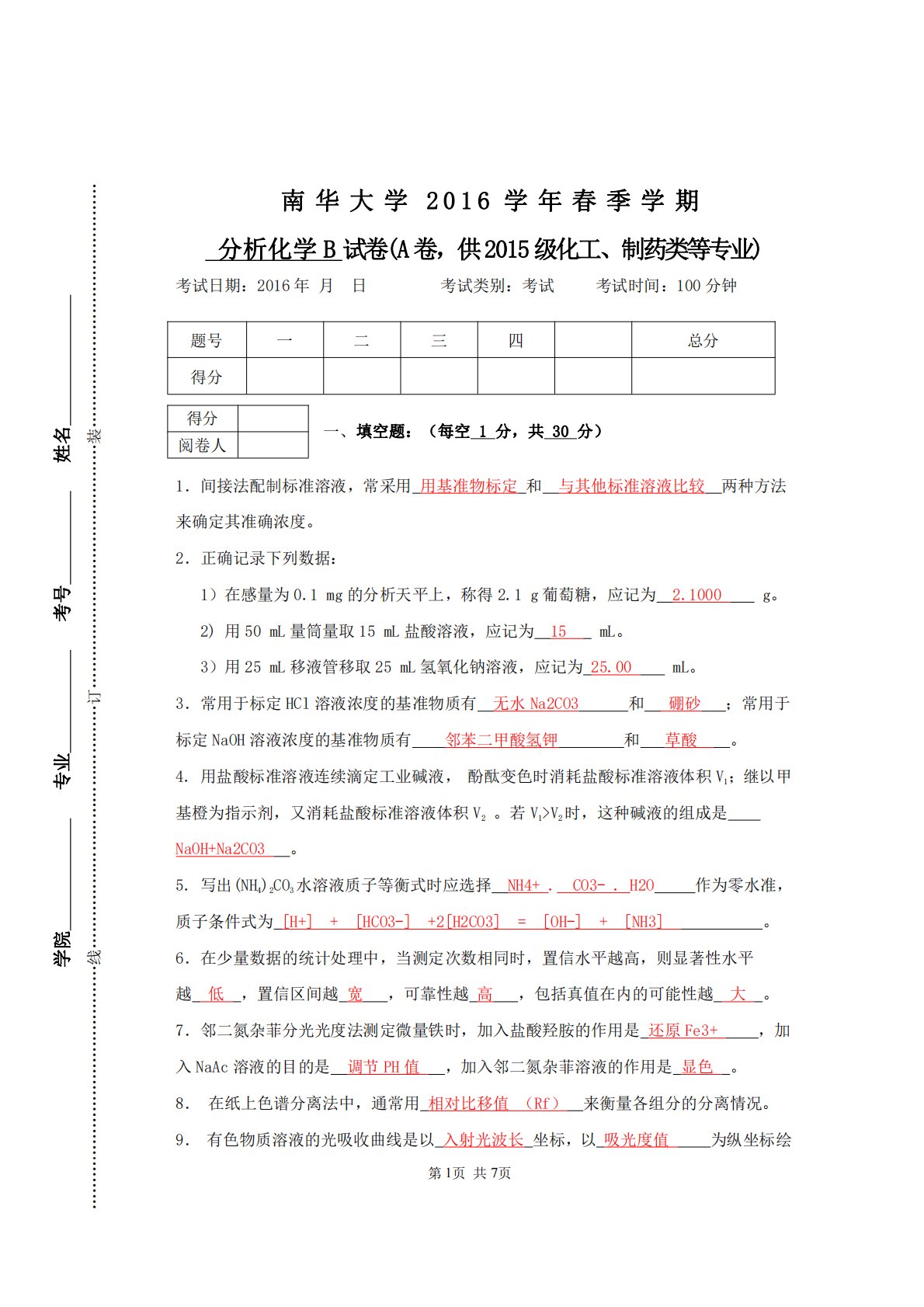 第1页共7页南华大学2016学年春季学期分析化学B试卷(A卷,供2015级化工、制药类等专业)考试日期:2016年月日考试类别:考试考试时间:100分钟题号一二三四总分得分一、填空题:(每空1分,共30分)1.间接法配制标准溶液,常采用用基准物标定和与其他标准溶液比较两种方法来确定其准确浓度。2.正确记录下列数据:1)在感量为0.1mg的分析天平上,称得2.1g葡萄糖,应记为2.1000g。2)用50mL量筒量取15mL盐酸溶液,应记为15mL。3)用25mL移液管移取25mL氢氧化钠溶液,应记为25.00mL。3.常用于标定HCl溶液浓度的基准物质有无水Na2CO3和硼砂;常用于标定NaOH...