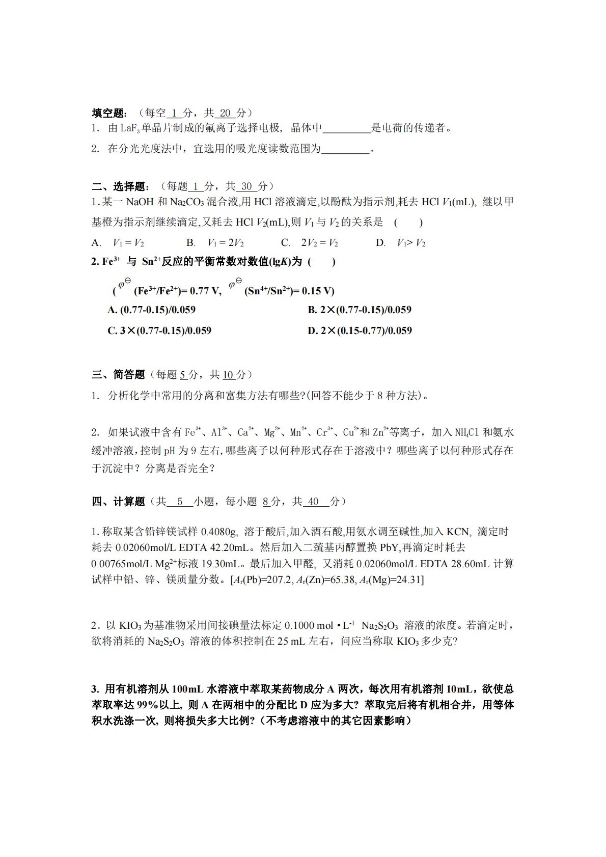 填空题:(每空1分,共20分)1.由LaF3单晶片制成的氟离子选择电极,晶体中是电荷的传递者。2.在分光光度法中,宜选用的吸光度读数范围为。二、选择题:(每题1分,共30分)1.某一NaOH和Na2CO3混合液,用HCl溶液滴定,以酚酞为指示剂,耗去HClV1(mL),继以甲基橙为指示剂继续滴定,又耗去HClV2(mL),则V1与V2的关系是()A.V1=V2B.V1=2V2C.2V2=V2D.V1>V22.Fe3+与Sn2+反应的平衡常数对数值(lgK)为()((Fe3+/Fe2+)=0.77V,(Sn4+/Sn2+)=0.15V)A.(0.77-0.15)/0.059B.2×(0....